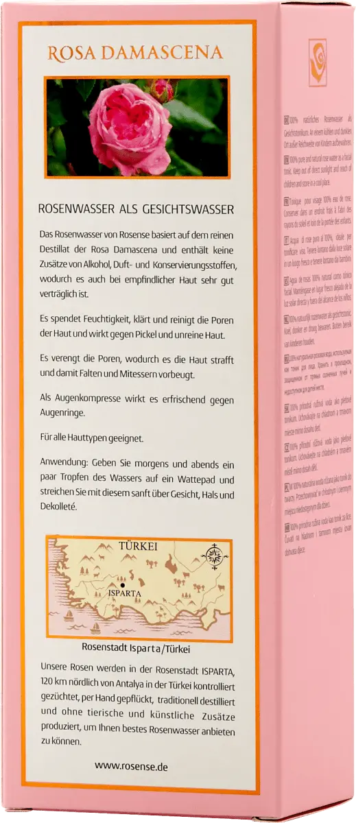 Розовая вода от Rosense увлажняет, осветляет и очищает поры кожи и эффективен против прыщей и загрязненной кожи. Он основан на чистом дистилляте розы дамасской и не содержит спирта, консервантов, искусственных ароматизаторов и красителей, что делает его очень хорошо переносимым даже чувствительной кожей. Розовая вода сужает поры, что подтягивает кожу и предотвращает появление морщин и черных точек. В качестве компресса для глаз он оказывает освежающее действие против темных кругов. Подходит для всех типов кожи.