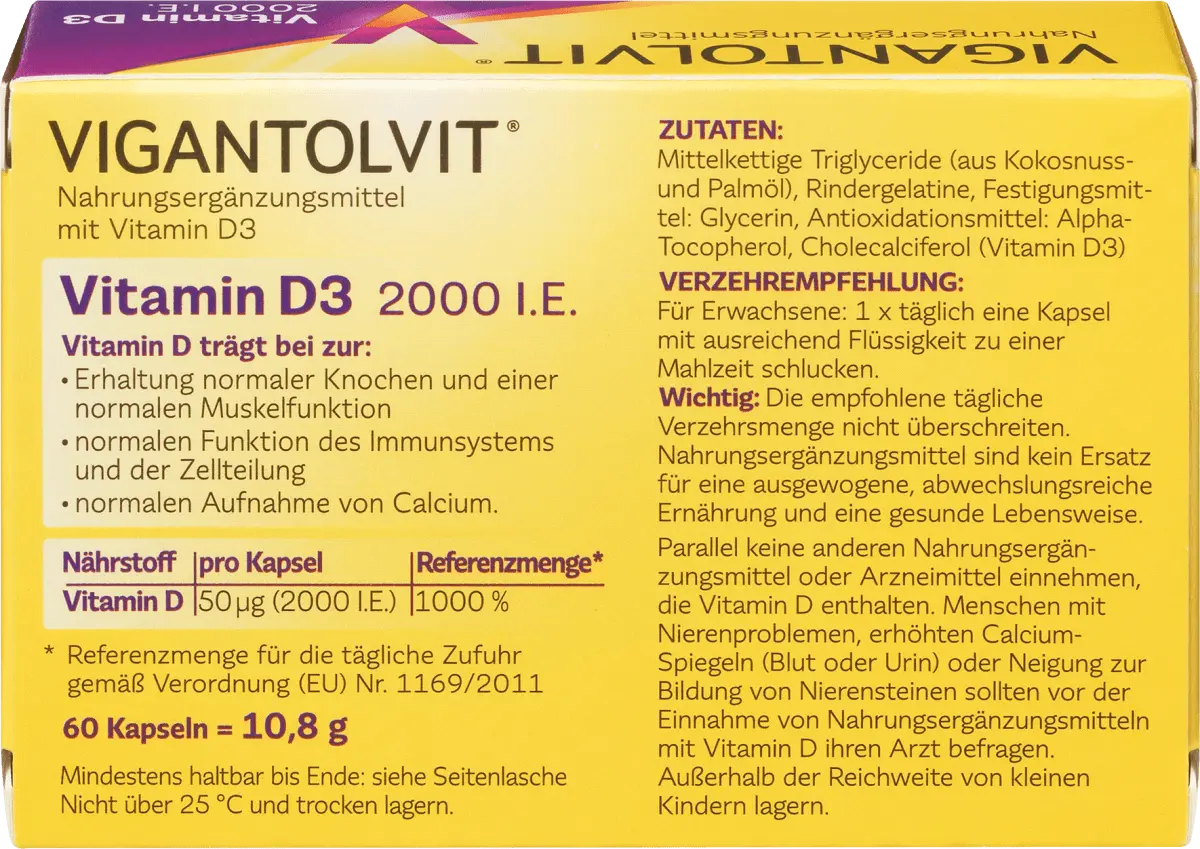 ВИГАНТОЛВИТ 2000 МЕ Витамина D3 в виде мягких капсул содержит витамин D и, таким образом, поддерживает вашу иммунную систему. Помимо прочего, витамин D также способствует поддержанию нормальной функции костей и мышц.