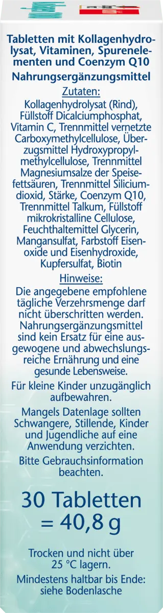 Точное название продукта: Таблетки с гидролизатом коллагена, витаминами, микроэлементами и пищевой добавкой коэнзима Q10 Состав: гидролизат коллагена (говядина), наполнитель дикальцийфосфат. , витамин С, антиадгезив сшитая карбоксиметилцеллюлоза, покрывающий агент гидроксипропилметилцеллюлоза, антиадгезив магниевые соли жирных кислот, антислеживатель диоксид кремния, крахмал, коэнзим Q10, антислеживатель тальк, наполнитель микрокристаллическая целлюлоза, увлажнитель глицерин, сульфат марганца , красящие оксиды и гидроксиды железа, сульфат меди, биотин