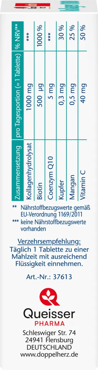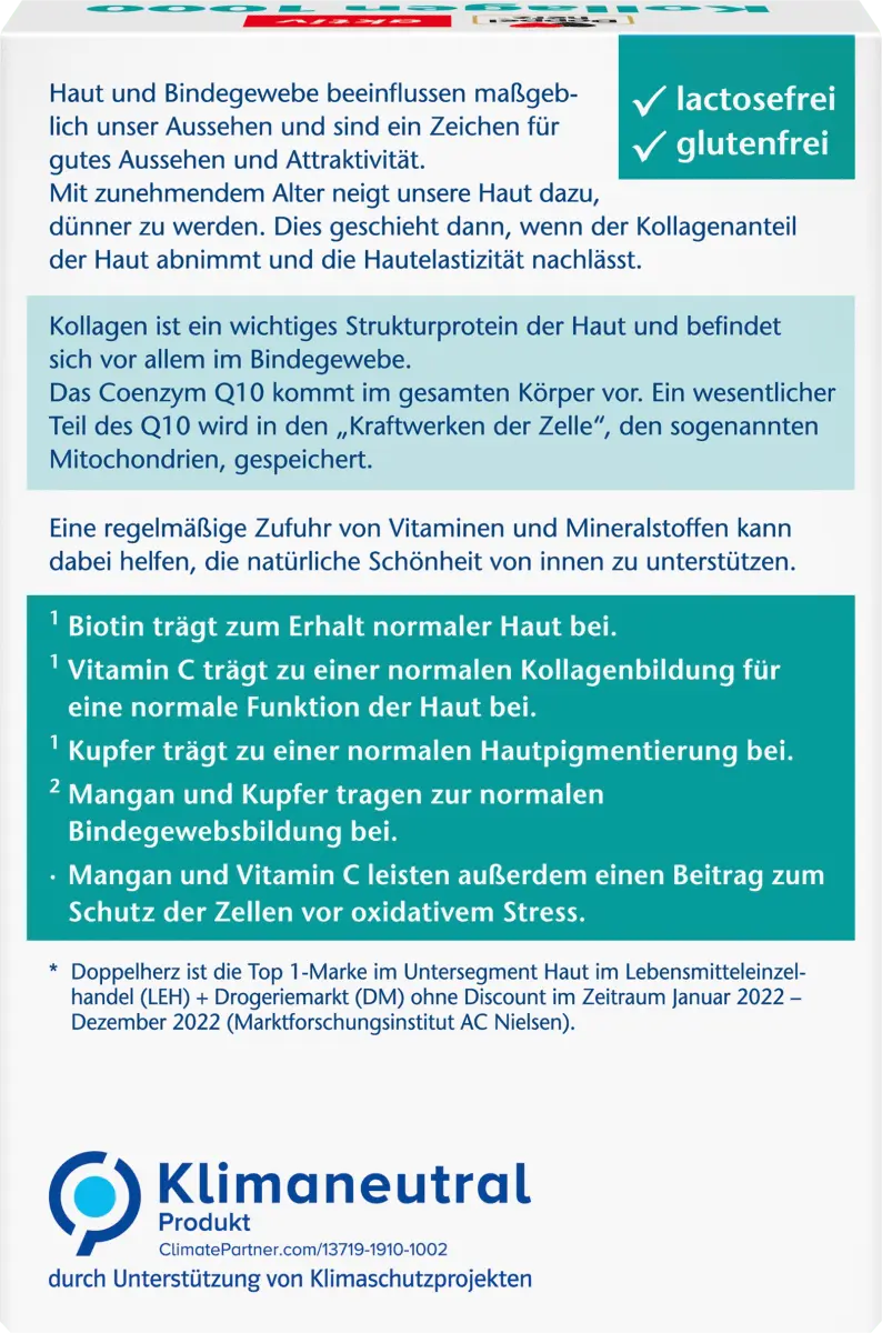 >Doppelherz active Collagen 1000 помогает поддерживать естественную красоту изнутри. С возрастом наша кожа имеет тенденцию становиться тоньше. Это происходит, когда содержание коллагена в коже снижается и снижается эластичность кожи. Коллаген является важным структурным белком кожи и содержится в основном в соединительной ткани. Коэнзим Q10 встречается по всему телу. Значительная часть Q10 хранится в «энергетических станциях клетки», так называемых митохондриях.