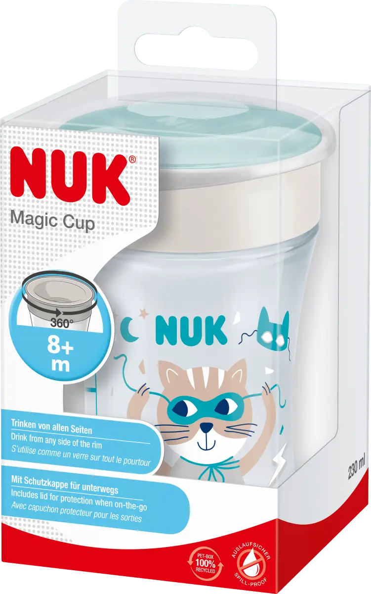 Научиться пить – это волшебство: чашка Evolution Magic Cup бирюзовая, 230 мл от Nuk позволяет детям пить, как взрослым. Потому что ободок для питья на 360° способствует и тренирует питье со всех сторон - без каких-либо ручек и почти как из обычной чашки. Единственное «волшебное» отличие: чашка не может протекать. Силиконовый диск герметизирует насадку изнутри. Питьё по-прежнему остается детской игрой: вашему ребенку достаточно лишь немного пососать край чашки. Чтобы чашка оставалась чистой и безопасной в дороге, ее защищает дополнительная крышка.