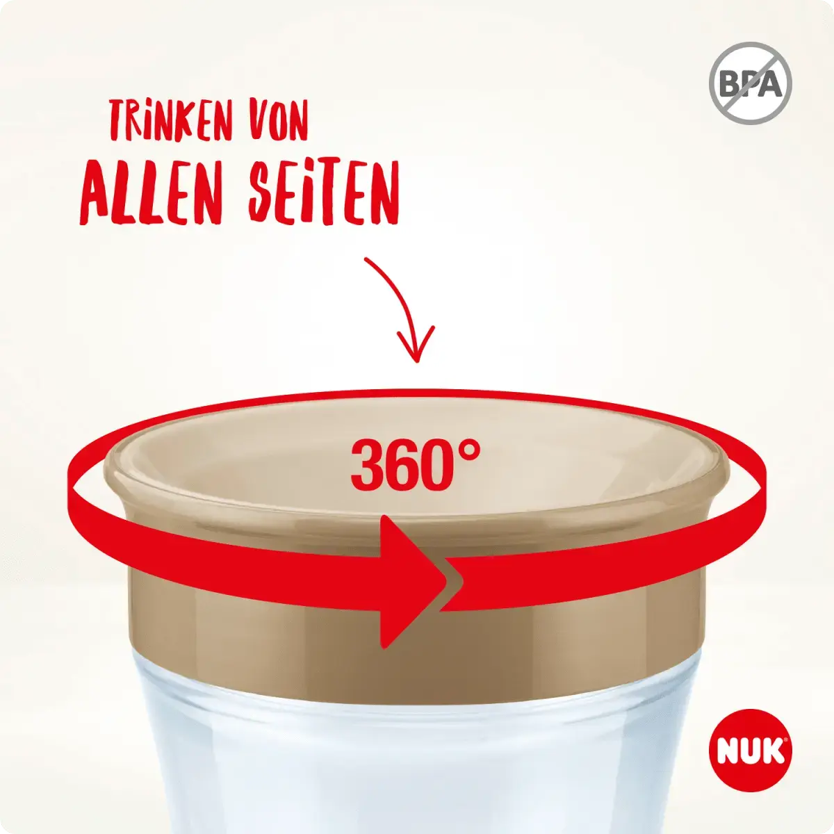 • Для безопасности и здоровья вашего ребенка ВНИМАНИЕ! Постоянное и продолжительное сосание жидкости приводит к разрушению зубов. Чтобы создать риск защемления пальцев, серии продуктов можно комбинировать. • Все неиспользованные детали следует хранить в недоступном для детей месте. • Никогда не прикрепляйте к изделию шнуры, ленты, шнурки или части одежды. Опасность удушения! • Чашка подходит для детей в возрасте 6 или 8 месяцев и не предназначена для кормления маленьких детей. • Храните отдельные детали в недоступном для маленьких детей месте: – Опасность удушья • Всегда проверяйте насадку для питья (особенно силиконовый диск) на наличие признаков износа и заменяйте при наличии видимых повреждений. • Если чашка повреждена изнутри (например, царапины), ее следует заменить из соображений гигиены. • Чашки NUK соответствуют европейскому стандарту безопасности EN14350. Внимательно прочитайте предупреждения и инструкции по использованию внутри. Bi