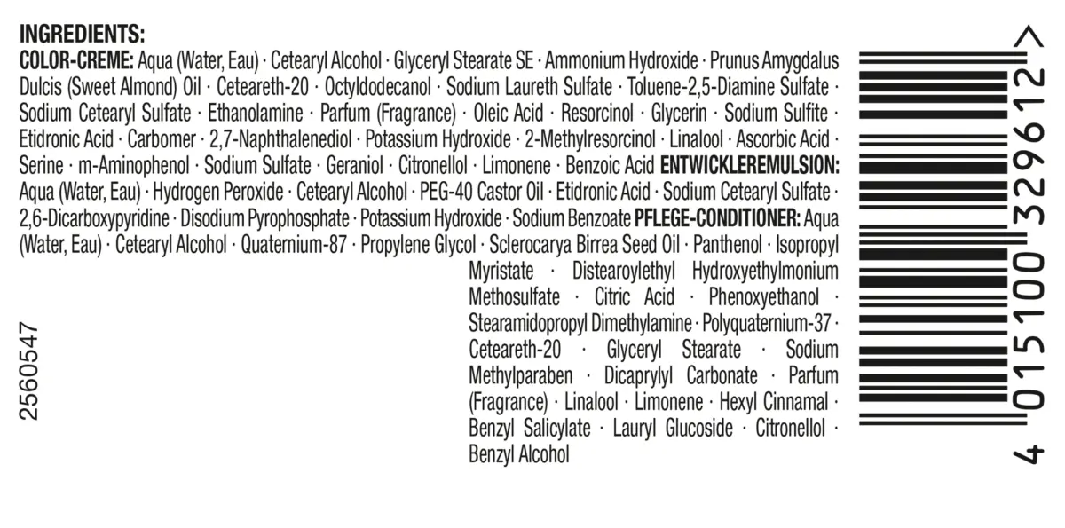 Краска/окрашивание волос, диоксосистема: вода*цетеариловый спирт*глицерилстеарат SE*гидроксид аммония*масло Prunus Amygdalus Dulcis*цетеарет-20*октилдодеканол*натрий. Лауретсульфат*Толуол-2,5-диаминсульфат*Цетеарилсульфат натрия*Этаноламин*Отдушка*Олеиновая кислота*Резорцин*Глицерин*Сульфит натрия*Карбомер*Этидроновая кислота*2,7-Нафталендиол*Гидроксид калия*2-Метилрезорцинол*Линалоол* Аскорбиновая кислота*Серин*м-аминофенол*Сульфат натрия*Гераниол*Цитронеллол*Лимонен*Бензойная кислота|Кондиционер, смываемый: Аква*Цетеариловый спирт*Кватерниум-87*Пропиленгликоль*Изопропилмиристат*Дистеароилэтилгидроксиэтилмонийметосульфат*Лимонная кислота*Феноксиэтанол* Стеарамидопропилдиметиламин*Поликватерниум-37*Цетеарет-20*Глицерилстеарат*Метилпарабен*Дикаприлилкарбонат*Масло семян склерокарии бирреи*Отдушка*Линалоол*Лимонен*Гексилциннамал*Бензилсалицилат*Лаурилглюкозид*Цитронеллол*Пантенол*Бензиловый спирт|Проявитель: Аква *Перекись водорода*Цетеариловый спирт*Касторовое масло ПЭГ-40*Этидроновая кислота*Цетеарилсульфат натрия*Динатрийпирофосфат*2,6-дикарбоксипиридин*Гидрокись калия*Бензоат натрия