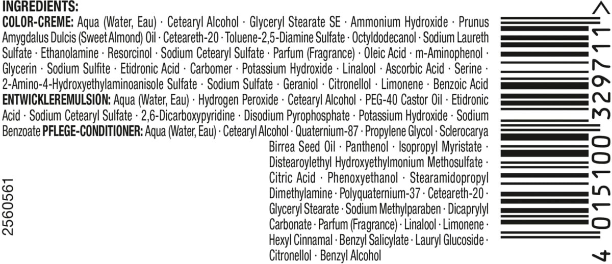 Краска/краска для волос, окислительная: вода*цетеариловый спирт*глицерилстеарат SE*гидроксид аммония*масло Prunus Amygdalus Dulcis*цетеарет-20*толуол-2. , 5-Диаминсульфат*Октилдодеканол*Лауретсульфат натрия*Этаноламин*Резорцин*Цетеарилсульфат натрия*Отдушка*Олеиновая кислота*м-аминофенол*Глицерин*Сульфит натрия*Этидроновая кислота*Карбомер*Гидроксид калия*Линалоол*Аскорбиновая кислота*Серин*2 - Амино-4-гидроксиэтиламиноанизолсульфат*сульфат натрия*гераниол*цитронеллол*лимонен*бензойная кислота *Поликватерниум-37*Цетеарет-20*Глицерилстеарат*Метилпарабен*Дикаприлилкарбонат*Масло семян склерокарии Birrea*Парфюм*Линалоол*Лимонен*Гексил циннамал *Бензилсалицилат*Лаурилглюкозид*Цитронеллол*Пантенол*Бензиловый спирт|Разработчик: Аква*Перекись водорода*Цетеариловый спирт*Касторовое масло ПЭГ-40*Этидроновая кислота*Цетеарилсульфат натрия*Диатрийпирофосфат*2,6-дикарбоксипиридин*Гидроксид калия*Натрий Бензоат
