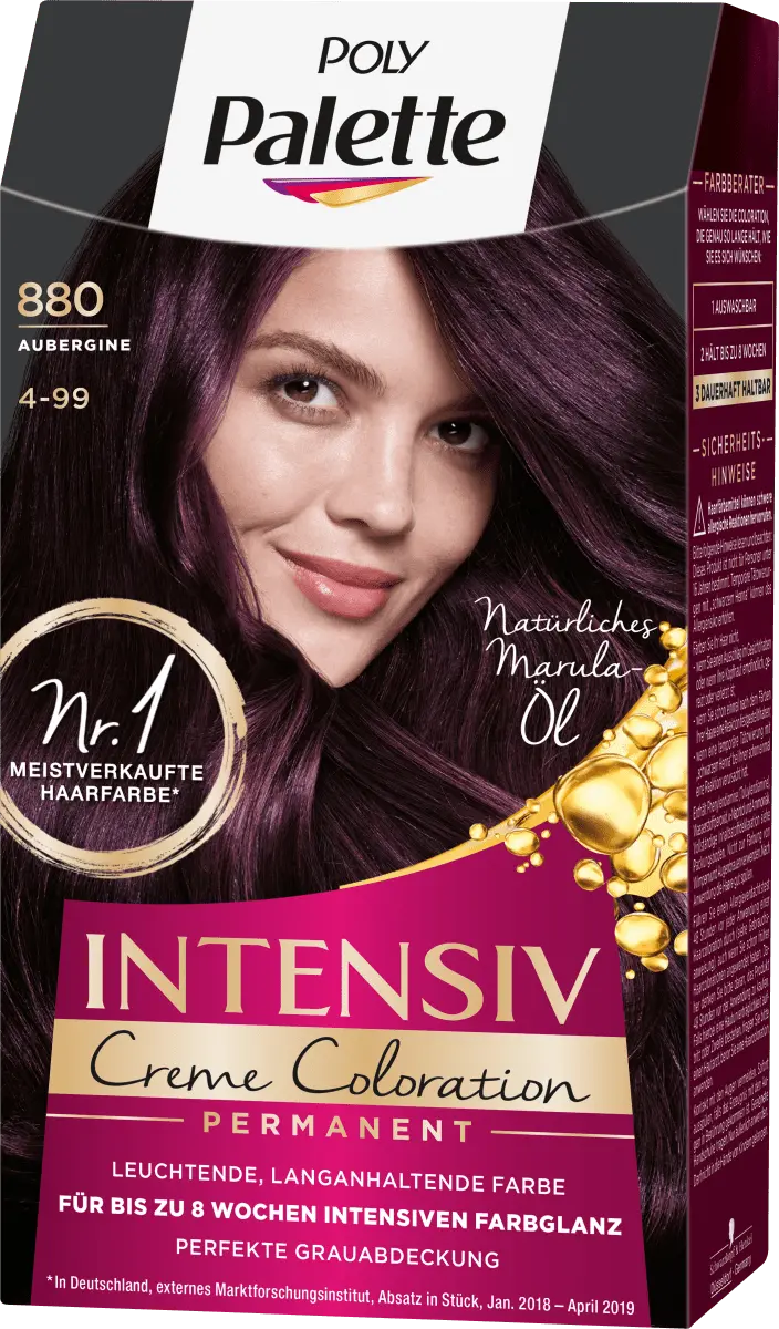 Палитра Poly краска для волос Баклажан 880 представляет собой насыщенный крем-краску с маслами. Это позволяет высококонцентрированным цветным пигментам проникать глубоко в волосы и закреплять их в волосах. Это обеспечивает особенно выразительный и стойкий цвет до 8 недель. Ухаживающая маска с натуральным маслом марулы разглаживает поверхность волос и придает им потрясающий блеск. Специально разработанная формула обеспечивает прекрасный результат окрашивания - от корней до кончиков.