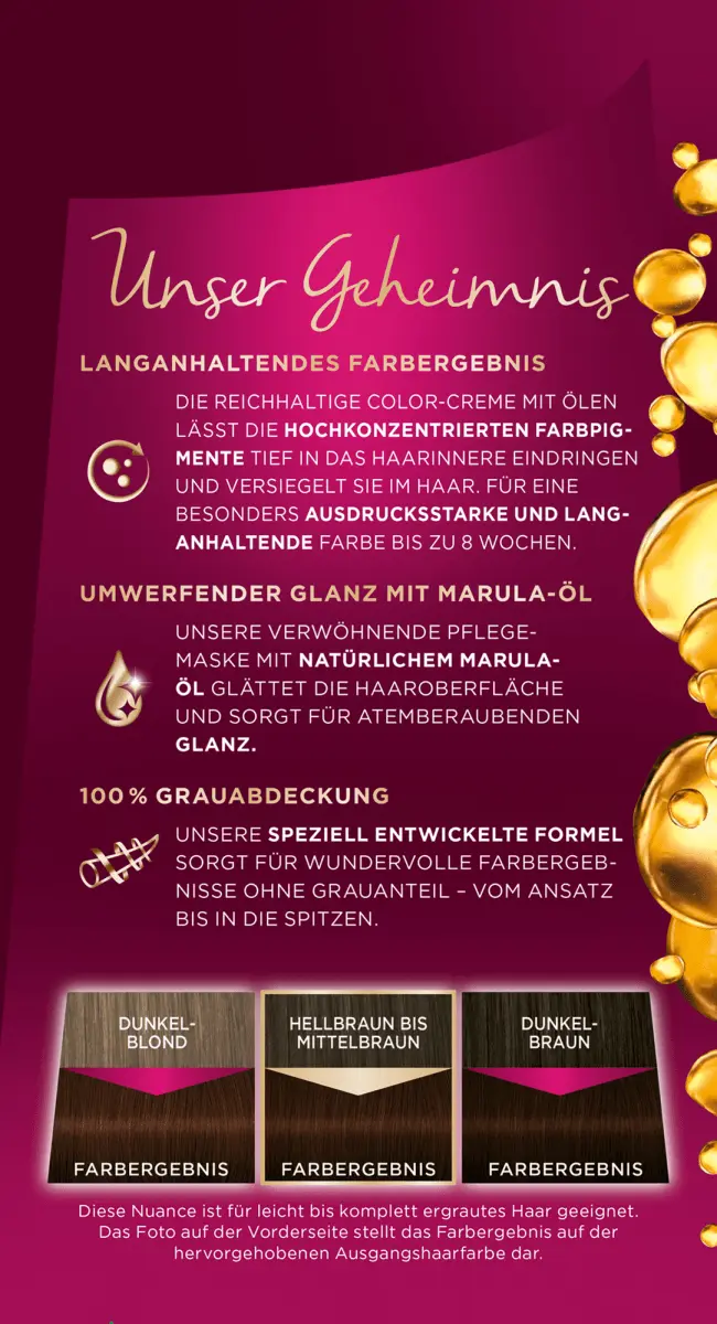 Этот нюанс. Подходит для следующих натуральных цветов волос: темно-русый, от светло-коричневого до средне-коричневого, темно-коричневый. Этот оттенок подходит для слегка или полностью седых волос. Точное применение указано на вкладыше.