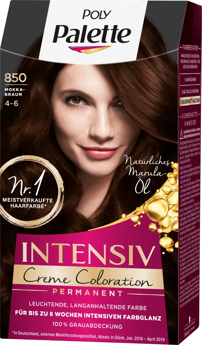 Палитра Poly краска для волос мокко коричневый 850 представляет собой насыщенный кремовый оттенок с маслами. Это позволяет высококонцентрированным цветным пигментам проникать глубоко в волосы и закреплять их в волосах. Это обеспечивает особенно выразительный и стойкий цвет до 8 недель. Ухаживающая маска с натуральным маслом марулы разглаживает поверхность волос и придает им потрясающий блеск. Специально разработанная формула обеспечивает прекрасный результат окрашивания - от корней до кончиков.