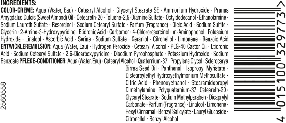Краска/краска для волос, окислительная: вода*цетеариловый спирт*глицерилстеарат SE*гидроксид аммония*масло Prunus Amygdalus Dulcis*цетеарет-20*толуол-2. , 5-Диаминсульфат*Октилдодеканол*Этаноламин*Лауретсульфат натрия*Резорцин*Цетеарилсульфат натрия*Отдушка*Олеиновая кислота*Сульфит натрия*Глицерин*2-амино-3-гидроксипиридин*Карбомер*Этидроновая кислота*4-хлоррезорцинол*м-аминофенол * Гидроксид калия * Линалоол * Аскорбиновая кислота * Серин * Сульфат натрия * Гераниол * Цитронеллол * Лимонен * Бензойная кислота | Кондиционер, смываемый: Аква * Цетеариловый спирт * Кватерниум-87 * Пропиленгликоль * Изопропилмиристат * Дистеароилэтилгидроксиэтилмоний метосульфат * Лимонная кислота * Феноксиэтанол *Стеарамидопропилдиметиламин*Поликварниум-37*Цетеарет-20*Глицерилстеарат*Метилпарабен натрия*Дикаприлилкарбонат*Масло семян склерокарии бирреи*Парфюм*Линалоол*Лимонен*Гексилциннамал*Бензилсалицилат*Лаурилглюкозид*Цитронеллол*Пантенол*Бензиловый спирт|Проявитель : Аква*Перекись водорода*Цетеариловый спирт*ПЭГ-40 Касторовое масло*Этидроновая кислота*Цетеарилсульфат натрия*Диатрийпирофосфат*2,6-Дикарбоксипиридин*Гидроксид калия*Бензоат натрия