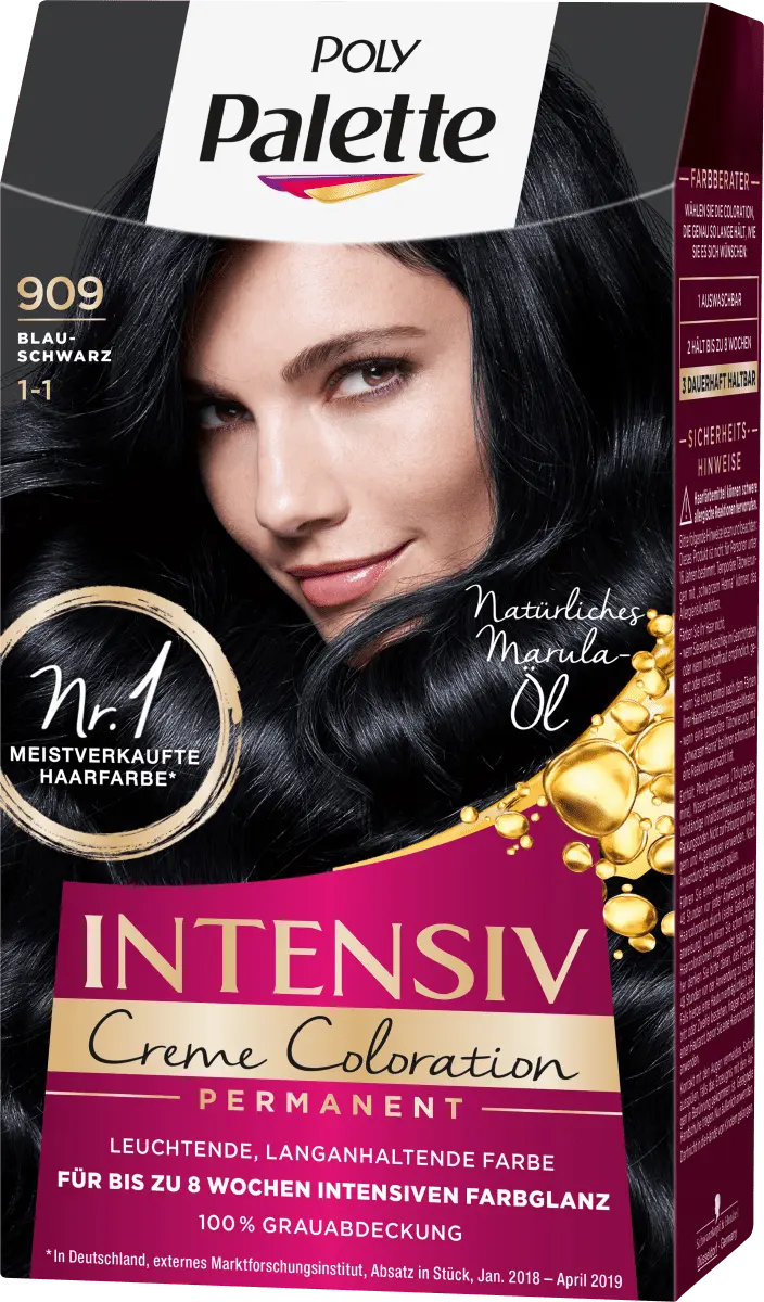 Палитра Poly цвет волос сине-черный 909 – это насыщенный кремовый оттенок с маслами. Это позволяет высококонцентрированным цветным пигментам проникать глубоко в волосы и закреплять их в волосах. Это обеспечивает особенно выразительный и стойкий цвет до 8 недель. Ухаживающая маска с натуральным маслом марулы разглаживает поверхность волос и придает им потрясающий блеск. Специально разработанная формула обеспечивает прекрасный результат окрашивания - от корней до кончиков.