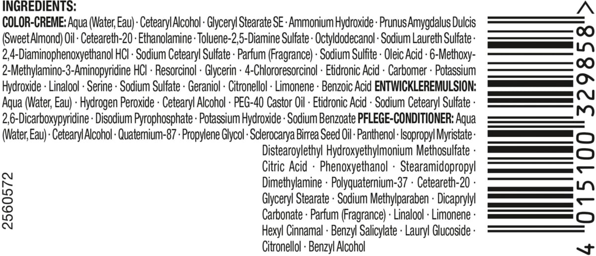 Ингредиенты: краска/краска для волос, окислительная: вода * цетеариловый спирт * глицерил стеарат SE * гидроксид аммония * масло чернослива Amygdalus Dulcis * цетеарет-20 * этаноламин. * Толуол-2,5-диаминсульфат*Октилдодеканол*Лауретсульфат натрия*2,4-диаминофеноксиэтанол HCl*Цетеарилсульфат натрия*Отдушка*Сульфит натрия*Олеиновая кислота*6-Метокси-2-метиламино-3-аминопиридин HCl*Резорцин* Глицерин *4-хлоррезорцин*Этидроновая кислота*Карбомер*Гидроксид калия*Линалоол*Серин*Сульфат натрия*Гераниол*Цитронеллол*Лимонен*Бензойная кислота|Кондиционер, смываемый: Аква*Цетеариловый спирт*Кватерниум-87*Пропиленгликоль*Изопропилмиристат* Дистеароилэтилгидроксиэтилмонийметосульфат*Лимонная кислота*Феноксиэтанол*Стеарамидопропилдиметиламин*Поликватерниум-37*Цетеарет-20*Глицерилстеарат*Метилпарабен*Дикаприлилкарбонат*Масло семян склерокарии бирреа*Парфюм*Линалоол*Лимонен*Гексилциннамал*Бензилсалицилат*Лаурилглюко сторона*Цитронелл ол* Пантенол*Бензиловый спирт|Проявитель: Аква*Перекись водорода*Цетеариловый спирт*ПЭГ-40 Касторовое масло*Этидроновая кислота*Цетеарилсульфат натрия*Динатрийпирофосфат*2,6-дикарбоксипиридин*Гидроксид калия*Бензоат натрия