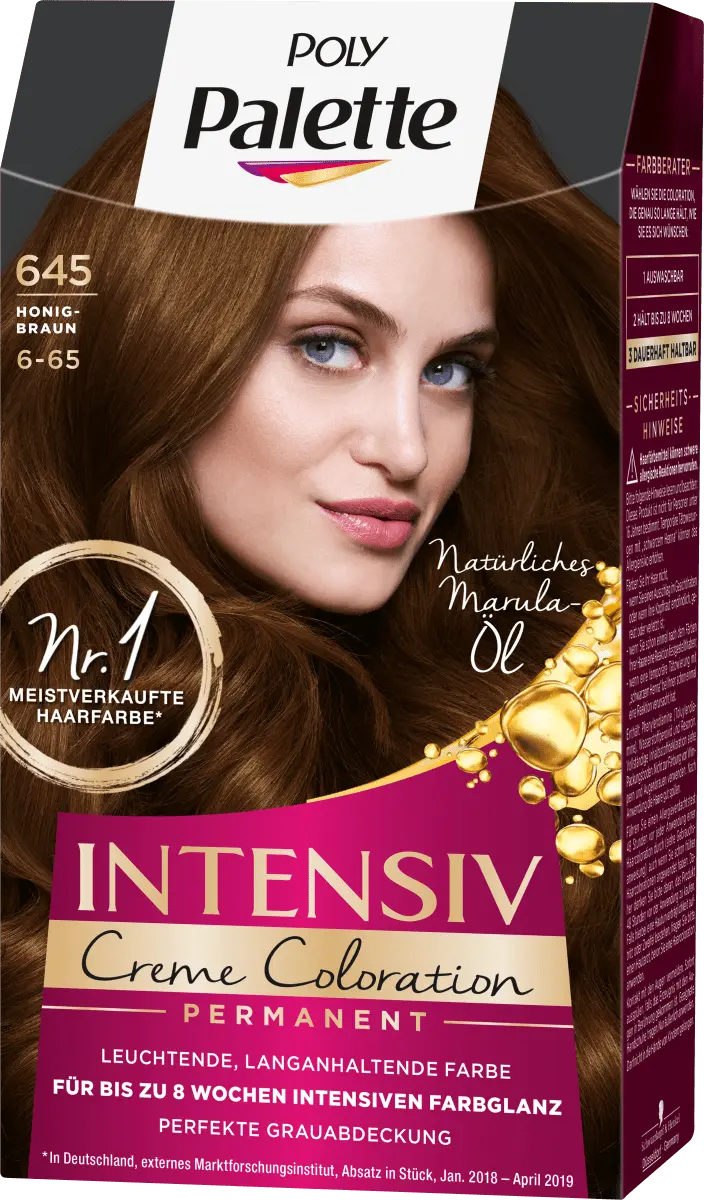 Палитра Poly краска для волос медово-коричневый 645 представляет собой насыщенный кремовый оттенок с маслами. Это позволяет высококонцентрированным цветным пигментам проникать глубоко в волосы и закреплять их в волосах. Это обеспечивает особенно выразительный и стойкий цвет до 8 недель. Ухаживающая маска с натуральным маслом марулы разглаживает поверхность волос и придает им потрясающий блеск. Специально разработанная формула обеспечивает прекрасный результат окрашивания - от корней до кончиков.