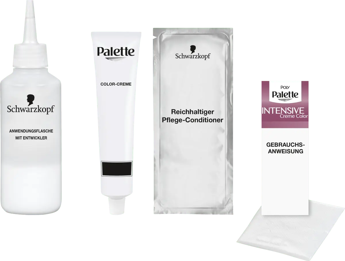 В данную упаковку входит 1 тюбик крем-краски (50 мл), 1 флакон-аппликатор эмульсии-проявителя (50 мл). ), 1 пакетик с кондиционером для ухода (15 мл), 1 пара перчаток, 1 инструкция по эксплуатации.