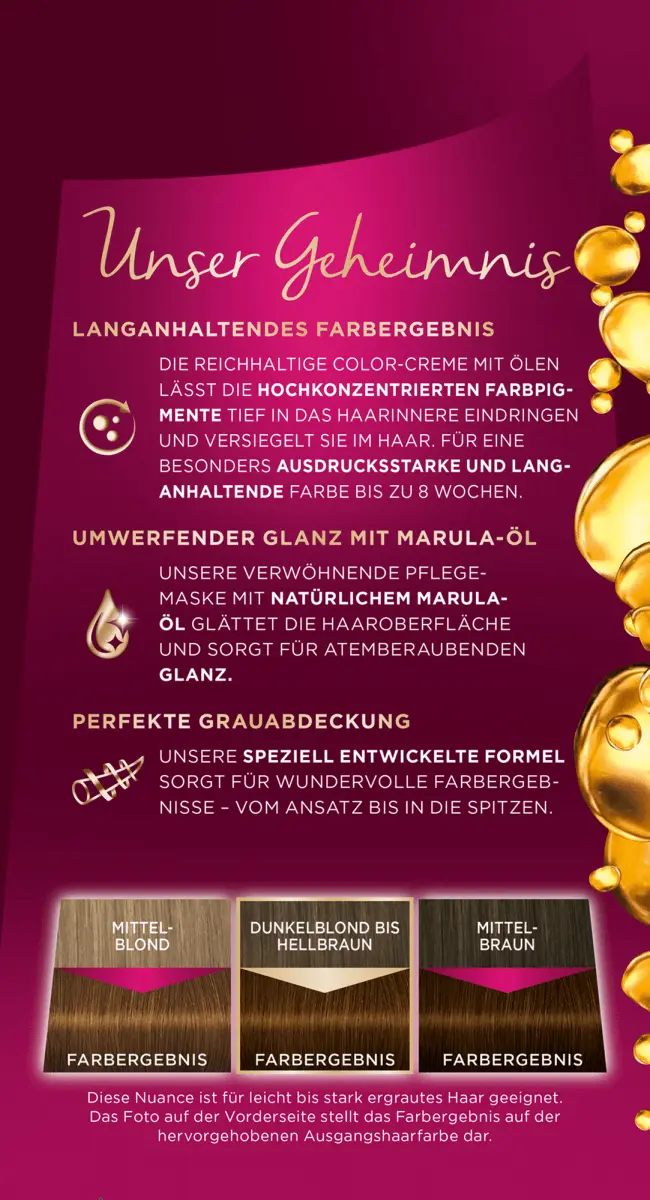 >Этот оттенок подходит для следующих натуральных цветов волос: от светло-русого до средне-русого, темно-русого, от светло-коричневого до средне-русого. Этот оттенок подходит для слегка или сильно седых волос. Точное применение указано на вкладыше.
