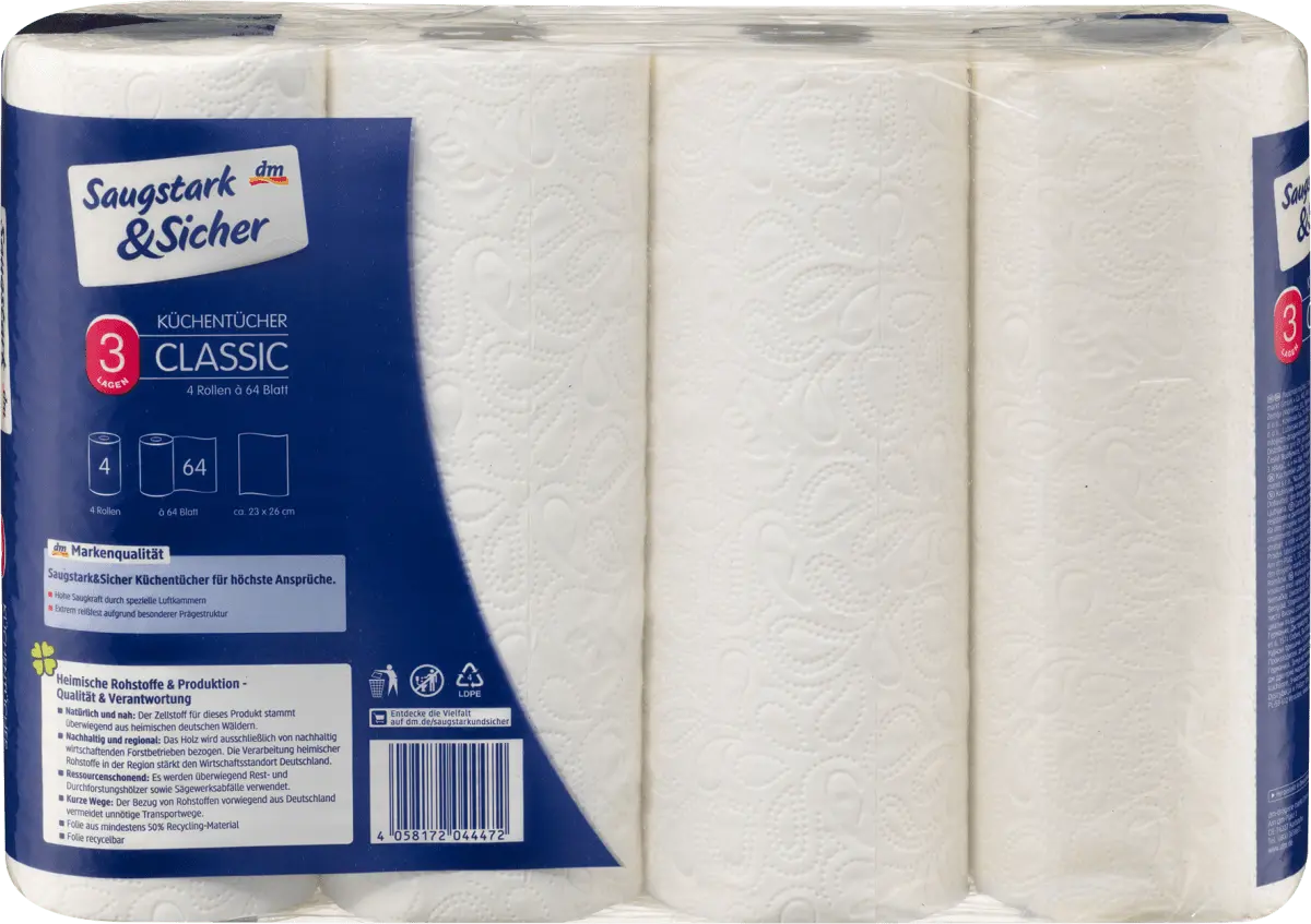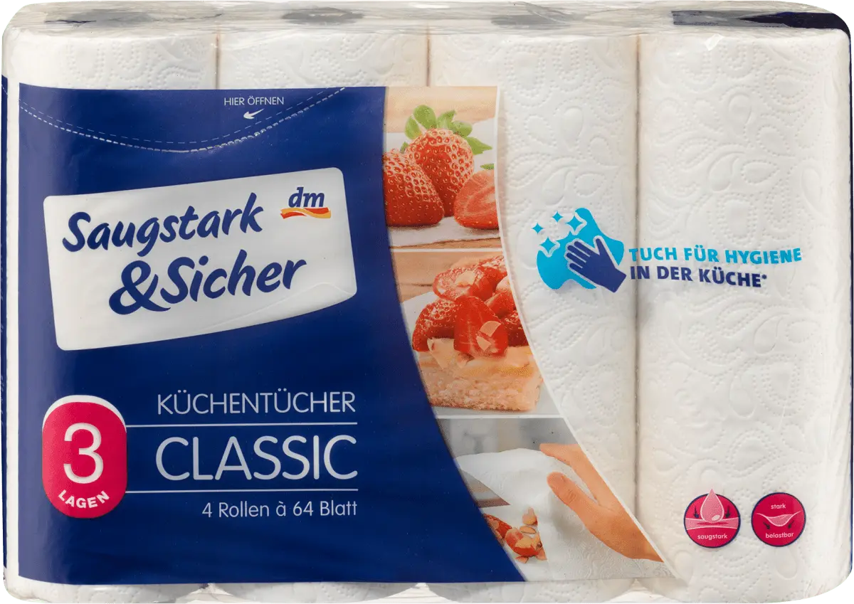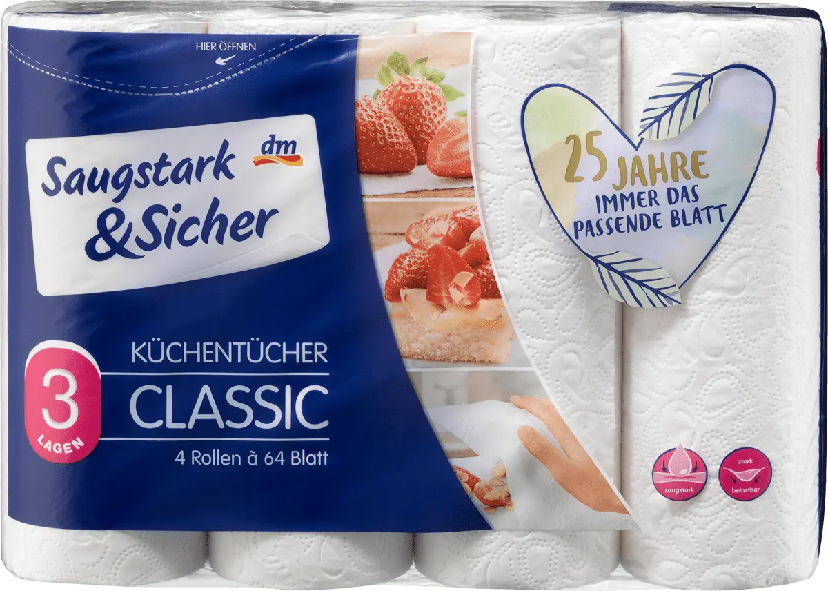 3-слойная впитывающая и безопасная кухня полотенца универсальны. Они имеют специальные воздушные камеры для высокой мощности всасывания. Благодаря особой рельефной структуре они также характеризуются высокой прочностью на разрыв. При переходе на 64 листа в рулоне экономится 110 тонн картона, 27 тонн пленки, 15 000 поддонов и 470 грузовых автомобилей.