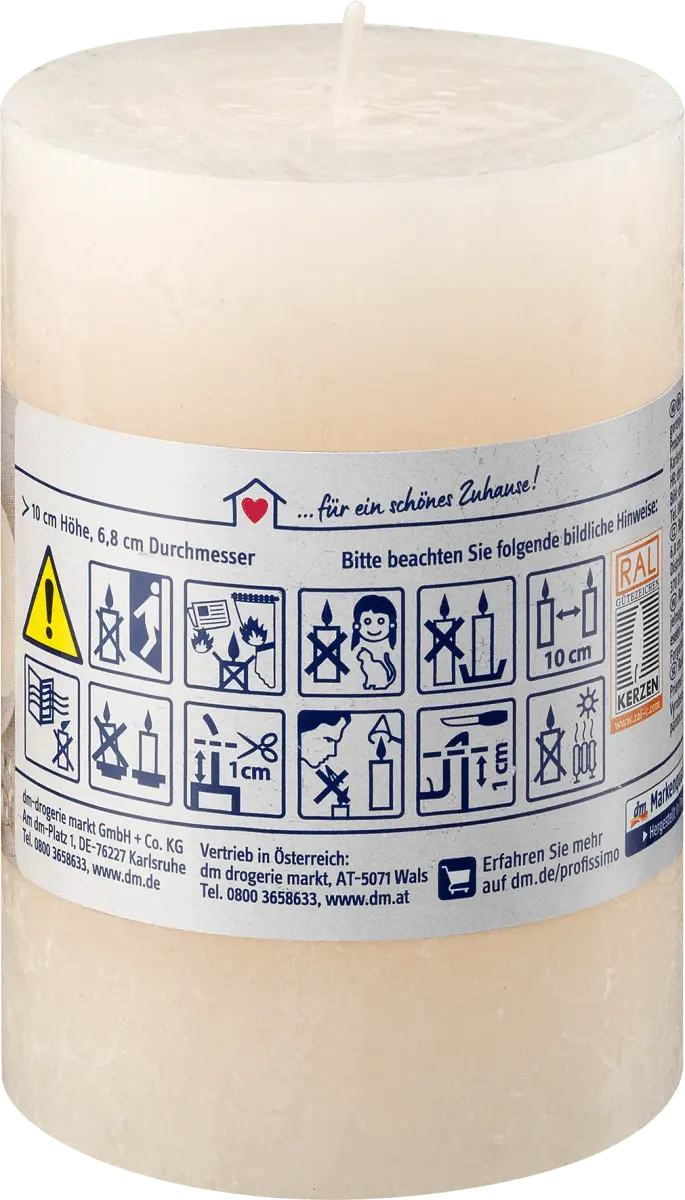 Свеча-столб в деревенском стиле цвета слоновой кости 100/68 от Profissimo не только создает уютную атмосферу. атмосферу, но также служит декоративным элементом и впечатляет особенно долгим временем горения. Он имеет красивую рустикальную поверхность и изготовлен из сырья качества RAL. Это означает, что он обладает очень хорошими свойствами горения.