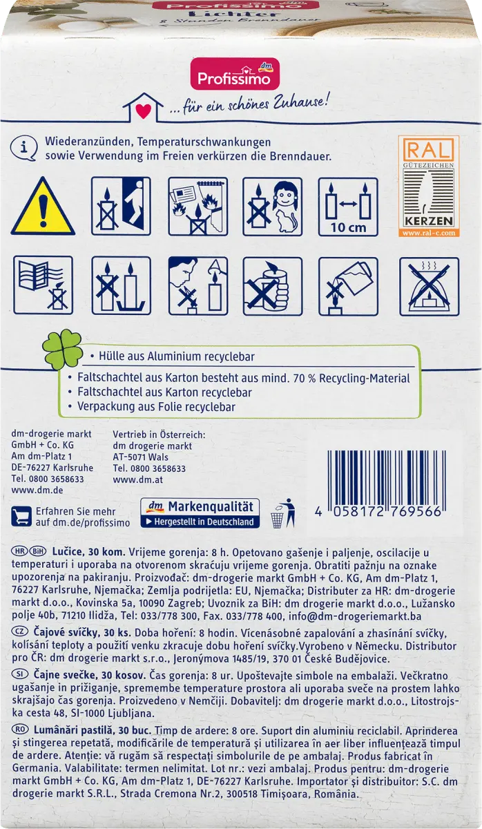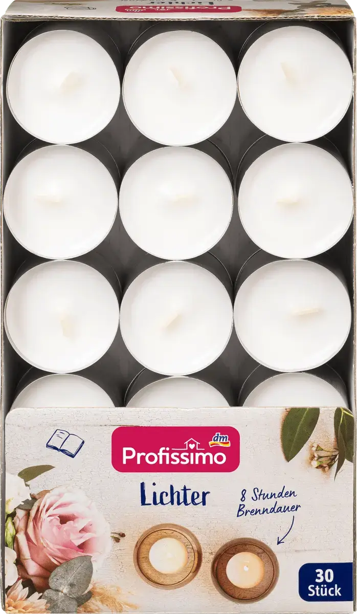 Эти чайные свечи от Profissimo в плоской коробке на 30 особенно набирают популярность благодаря минимальному времени горения 8 часов. Это означает, что у вас будет вдвое больше времени горения по сравнению с обычными чайными свечами — 4 часа. Чайные свечи горят равномерно и надежно и заключены в алюминиевый колпачок.
