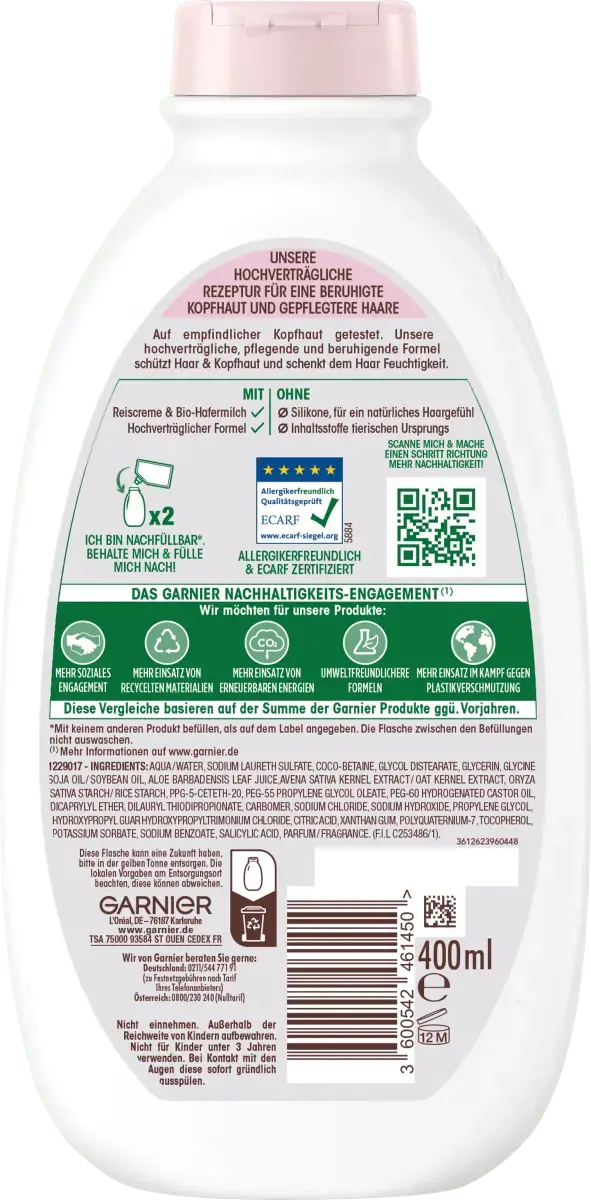 Garnier True Treasures Soothing Shampoo Gentle Oat Milk 400 мл питает и интенсивно балует чувствительные волосы – от корней до кончиков. Шампунь сочетает в себе рисовые сливки и органическое овсяное молоко в кремовой, нежной формуле ухода за особенно эластичными волосами. Овсяное молоко известно своим успокаивающим действием на чувствительную и зудящую кожу головы, а рисовые сливки обладают питательными, защитными и увлажняющими свойствами. Формула с высокой переносимостью также была сертифицирована ECARF. Для успокоения кожи головы и большего питания волос.