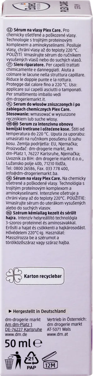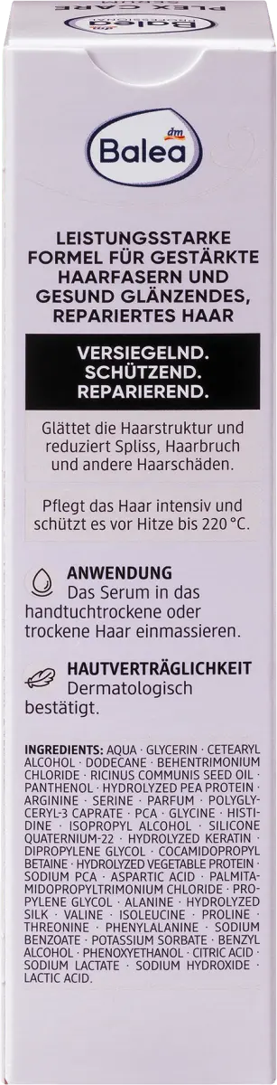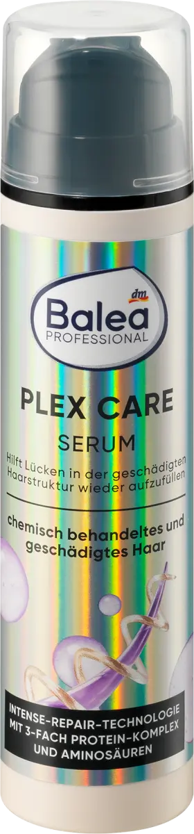 Сыворотка Plex Care от Balea Professional восстанавливает, уплотняет и защищает благодаря своей мощной формуле, обеспечивающей заметный и видимый результат. Технология Intense Repair с тройным протеиновым комплексом и аминокислотами укрепляет волосы и восстанавливает поврежденную структуру волос. Разглаживает структуру волос, уменьшает секущиеся кончики, ломкость и другие повреждения волос. Интенсивно питает волосы и защищает их от нагрева до 220°C. Результат - укрепленные волокна волос и здоровые, блестящие, восстановленные волосы.
