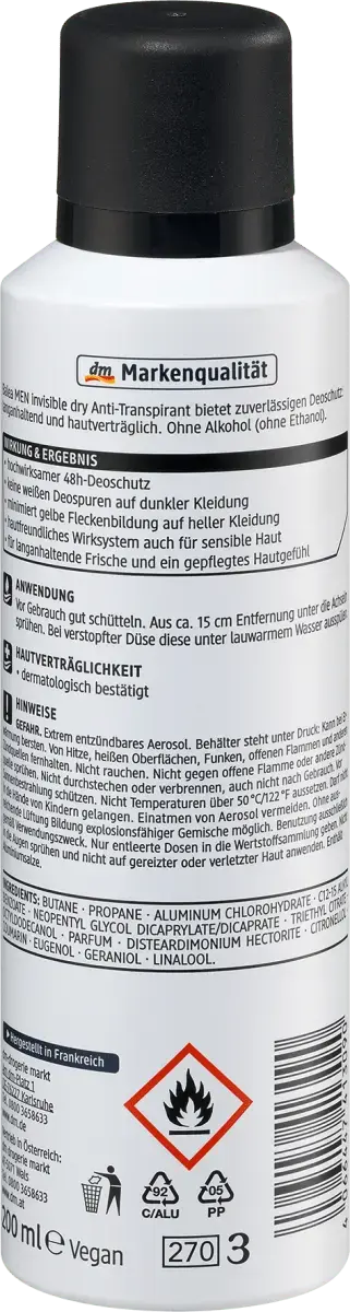 Дезодорант-спрей-антиперспирант Fresh Invisible Dry от Balea MEN обеспечивает надежную, длительную и приятную для кожи дезодорантную защиту. Эта защита сохраняется до 48 часов. Формула не оставляет белых следов дезодоранта на темной одежде и минимизирует появление желтых пятен на светлой одежде. Рецептура без микропластика и водорастворимых, чисто синтетических полимеров.