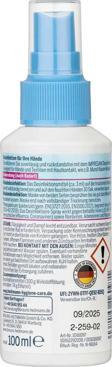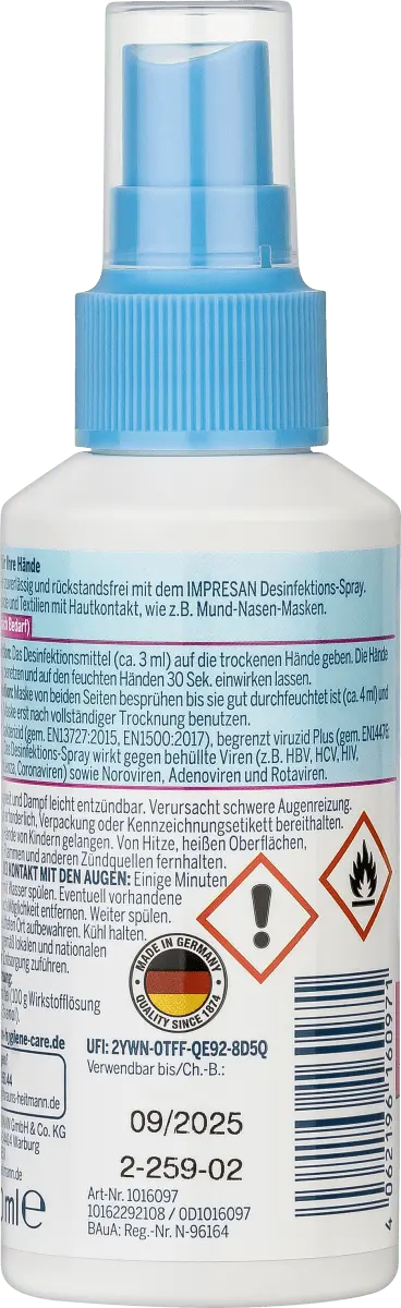 Защитите свою семью от болезнетворных микроорганизмов дома, в дороге и во время путешествий Germ с практичным дезинфицирующим спреем для рук Impresan. Обеспечивает чистые руки без использования воды. Спрей также подходит для дезинфекции масок для рта и носа.