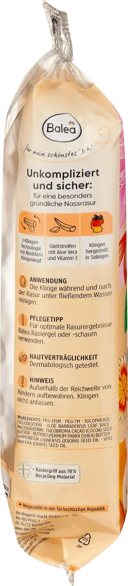 Одноразовые бритвы Balea с 3 лезвиями не только обеспечивают превосходные результаты, но и просты в уходе. использовать. Благодаря точному тройному лезвию и гибкой поворотной головке возможно тщательное влажное бритье - даже в зоне бикини. Противоскользящая ручка обеспечивает надежный захват, а скользящая полоска с алоэ вера и витамином Е обеспечивает уход за кожей.