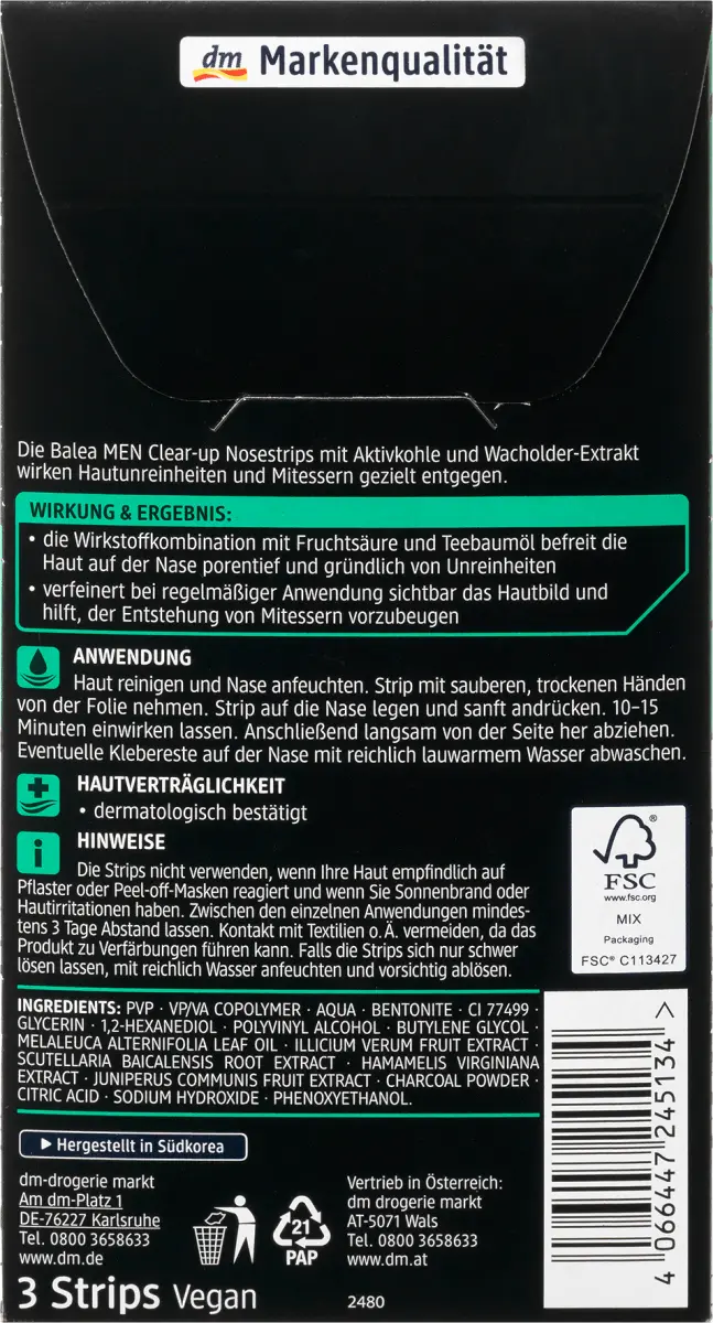 Прозрачные полоски для носа Balea MEN Clear-Up с активированным углем и экстрактом можжевельника специально противодействуют загрязнениям кожи и черные точки. Сочетание активных ингредиентов с фруктовыми кислотами и маслом чайного дерева тщательно и тщательно удаляет загрязнения с кожи в области носа. Кроме того, при регулярном использовании внешний вид кожи заметно улучшается.