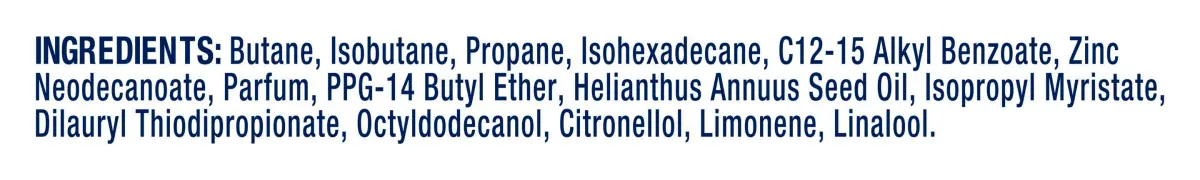 Состав: бутан, изобутан, пропан, изогексадекан, C12-15 алкилбензоат, неодеканоат цинка, отдушка, бутиловый эфир PPG-14, масло семян Helianthus Annuus, изопропилмиристат, Дилаурилтиодипропионат, Октилдодеканол, Цитронеллол, Лимонен, Линалоол.