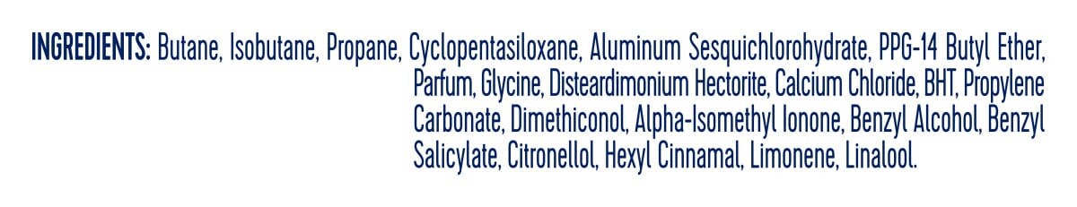 ингредиенты: бутан, изобутан, пропан, циклопентасилоксан, сесквихлоргидрат алюминия, бутиловый эфир PPG-14, отдушка, глицин, дистеардимоний гекторит, хлорид кальция, BHT, пропиленкарбонат, диметиконол, альфа-изометилионон, Бензиловый спирт, бензилсалицилат, цитронеллол, гексилциннамал, лимонен, линалоол.