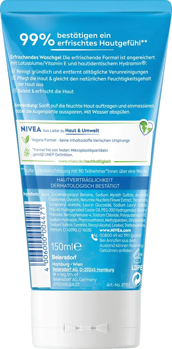 Освежающий гель для умывания NIVEA с витамином E тщательно очищает. Благодаря освежающей формуле он оживляет кожу и поддерживает естественный баланс влаги в коже. Для сияющей свежести кожи. Мягко пенящийся очищающий гель для лица приятно пахнет свежестью и оставляет на коже ощущение чистоты.