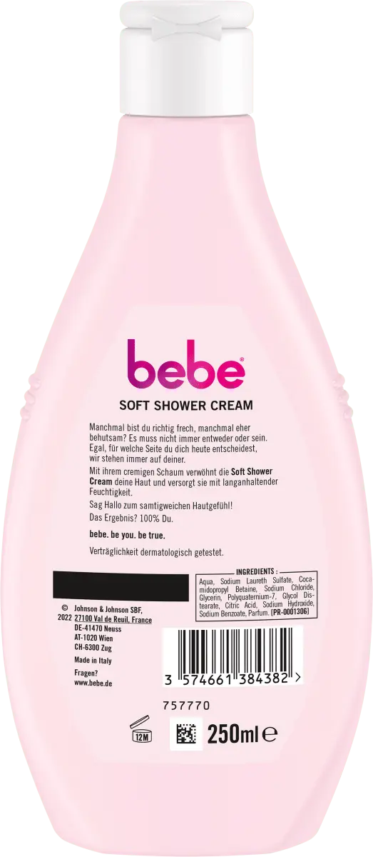 >Крем-крем для душа Bebe Soft Shower Cream балует вашу кожу бархатисто-мягким ощущением и обеспечивает гладкий уход за кожей. Совместимость средства для ухода за душем прошла дерматологические испытания, поэтому он подходит и для чувствительной кожи. Кремовый гель для душа был специально разработан для сухой кожи и питает ее длительной влажностью и нежным ароматом. Упаковка также подлежит вторичной переработке. Такие ингредиенты, как масло жожоба и пантенол, увлажняют кожу, делая ее эластичной и заметно мягкой на долгое время.
