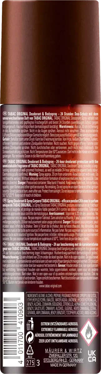 Дезодорант-спрей Tabac Original обеспечивает 24-часовую дезодорантную защиту с неповторимым ароматом Tabac Original. Подчеркивает личную харизму тонкой мужской заботы и обеспечивает длительное ощущение свежести.