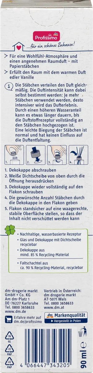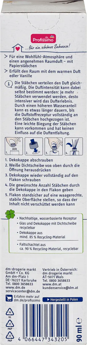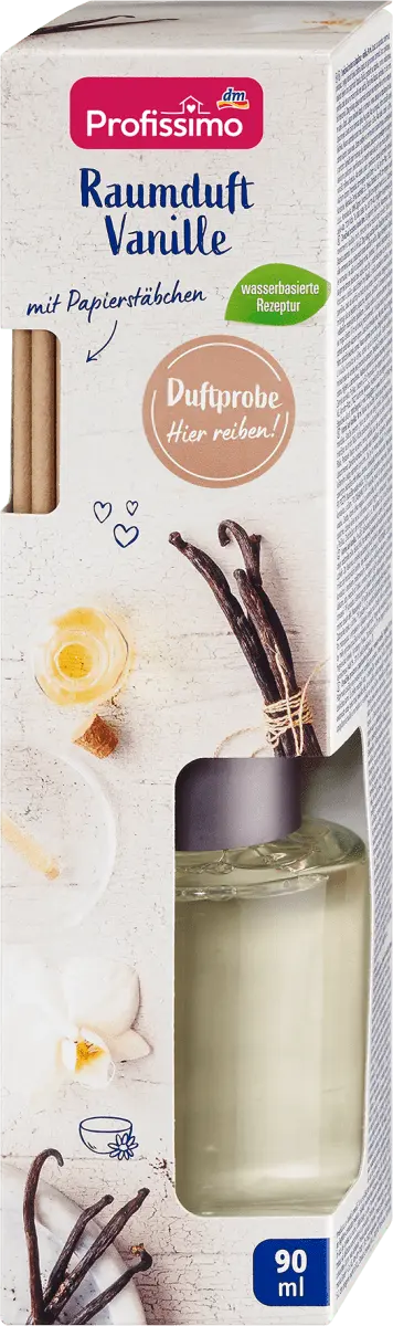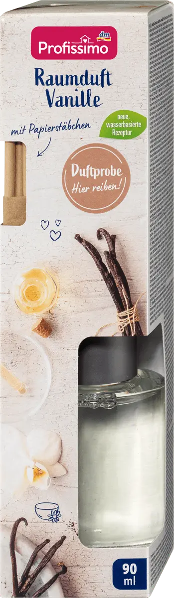 Ванильный аромат для комнаты от Profissimo наполняет комнату сладкими ароматами и создает приятное ощущение. -хорошая атмосфера. Палочки декоративного ароматизатора для комнаты изготовлены из возобновляемого сырья – бумаги. Для ощущения свежести аромата, когда вы вернетесь домой.