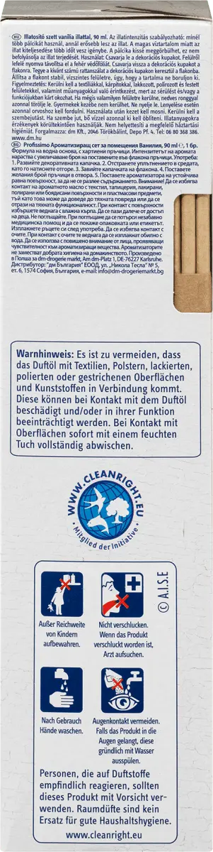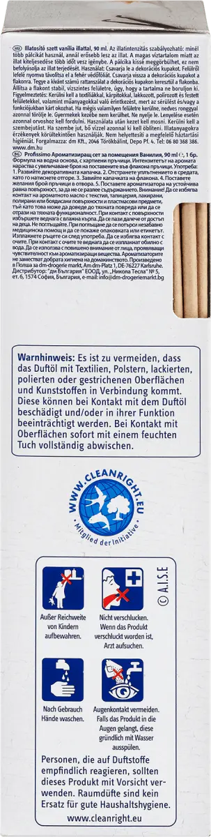 Важно избегать контакта ароматического масла с тканями, обивкой, окрашенными предметами. , полированные предметы или окрашенные поверхности и пластмассы. Они могут быть повреждены и/или их функция нарушена при контакте с ароматическим маслом. При попадании на поверхности немедленно полностью протрите их влажной тряпкой. Людям, чувствительным к ароматам, следует использовать этот продукт с осторожностью. Ароматизаторы для помещений не заменяют хорошую домашнюю гигиену. Хранить в недоступном для детей месте.