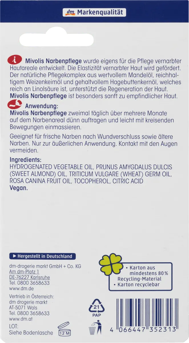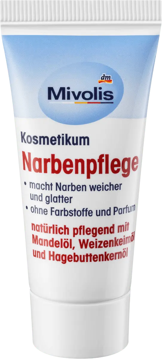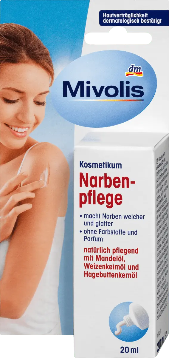 Шрам Mivolis уход был специально разработан для ухода за поврежденными участками кожи. Повышается эластичность рубцовой кожи. Натуральный комплекс ухода, состоящий из ценного миндального масла, богатого масла зародышей пшеницы и богатого масла семян шиповника, богатого линолевой кислотой, поддерживает регенерацию кожи. Уход за рубцами Mivolis особенно бережен для чувствительной кожи.