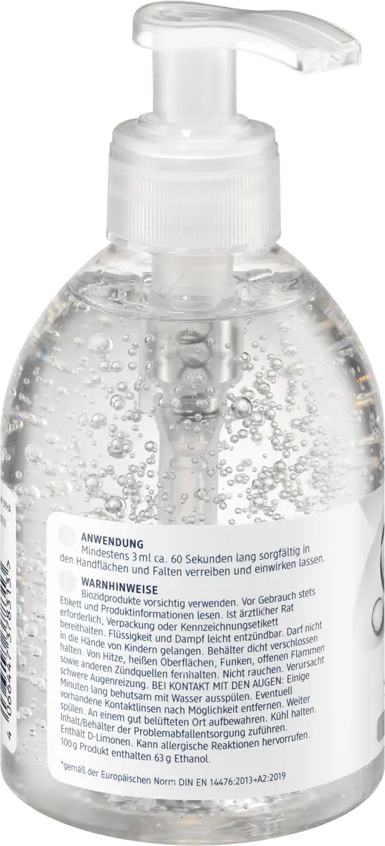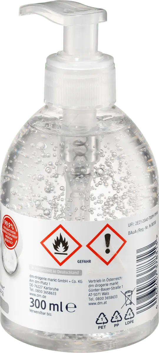 Этот гель для рук Balea Hygiene также удаляет 99,9% бактерий. специальные вирусы (*согласно EN 14476: 2013+A2: 2019), такие как коронирусные вирусы (например, Sars-CoV-2).
