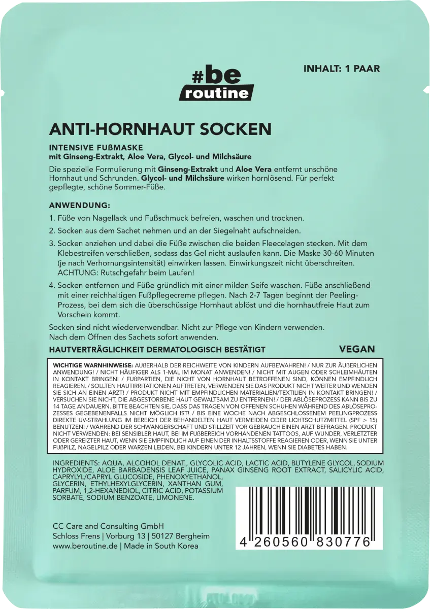 The b.e. Обычная маска для ног в носке обеспечивает гибкость и мягкость ног. Интенсивная маска для ног удаляет мозоли и уменьшает трещины. Гликолевая и молочная кислоты с экстрактом женьшеня и алоэ вера гарантируют эффективное лечение.