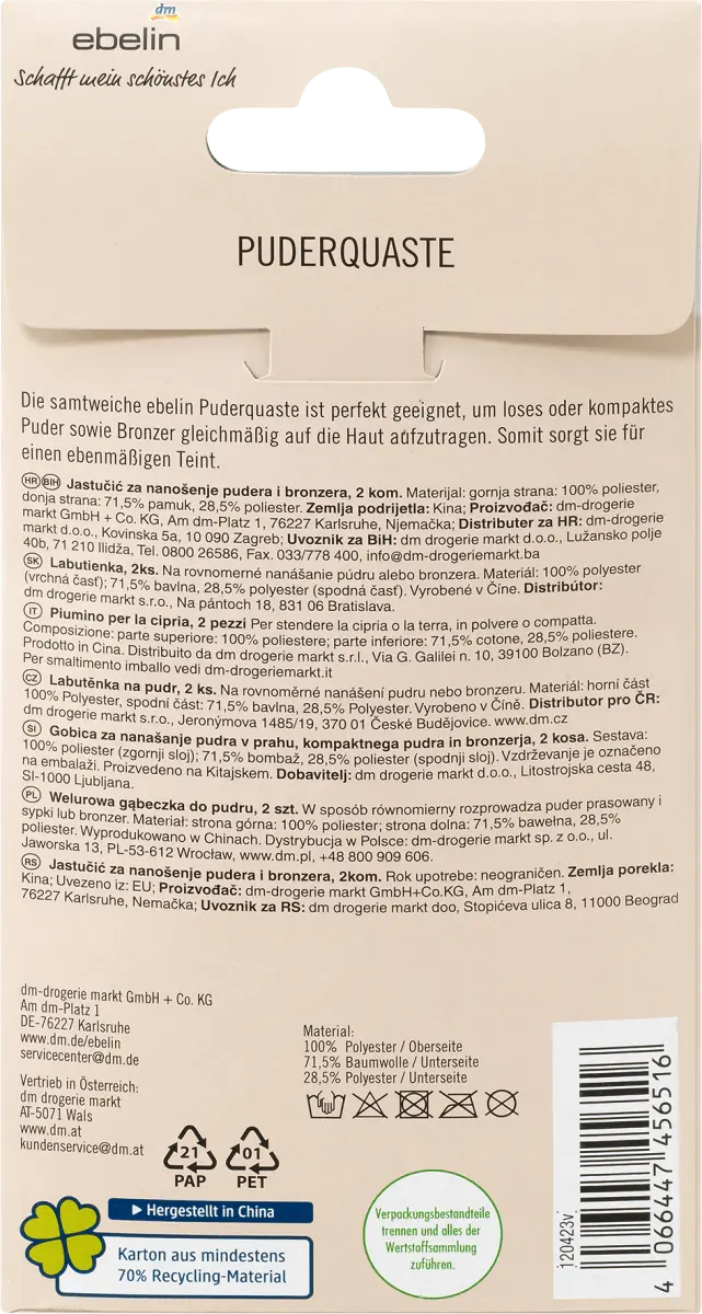 Мягкая пуховка в упаковке по 2 штуки из серии ebelin идеально подходит для равномерного нанесения рассыпчатой ​​и компактной пудры и бронзатор. Бархатисто-мягкое косметическое средство также впечатляет практичной повязкой на палец.