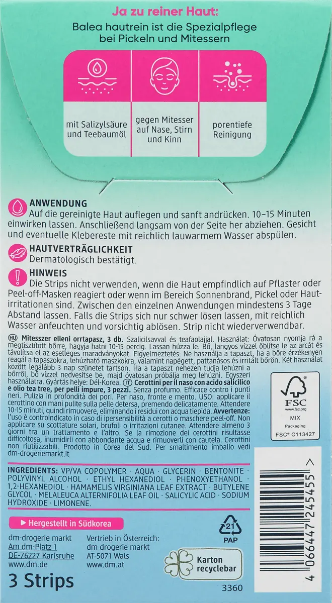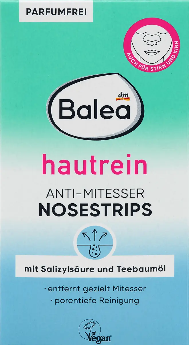 Полоски для носа против черных точек Balea Skin Pure – немедленная помощь угри. Формула с салициловой кислотой и маслом чайного дерева специально удаляет черные точки на носу, лбу и подбородке и обеспечивает глубокое очищение пор. Быстрое и простое применение. Веган.