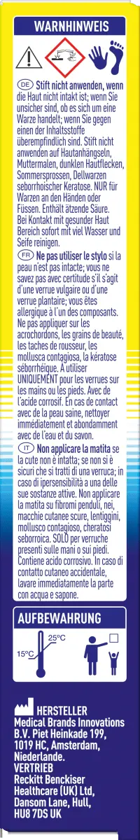 Этот продукт НЕ подходит для использования при диабете или нарушениях кровообращения. Пожалуйста, проконсультируйтесь с врачом или ортопедом. Используйте только на руках или ногах. Не используйте ручку, если бородавка расположена где-либо кроме руки или ноги, если у вас кровоточащая, раздраженная, воспаленная кожа или кожа с признаками воспаления, такими как зуд или отек, кожные пятна, родимые пятна, темные пятна на коже, Веснушки, бородавки (контагиозный моллюск), себорейный кератоз (Verruca seborrheica) или шелушение кожи, если у вас повышенная чувствительность к любому из ингредиентов. Если вы не уверены, обратитесь к своему семейному врачу. Ручка содержит едкую кислоту. Не наносите гель на здоровую кожу.