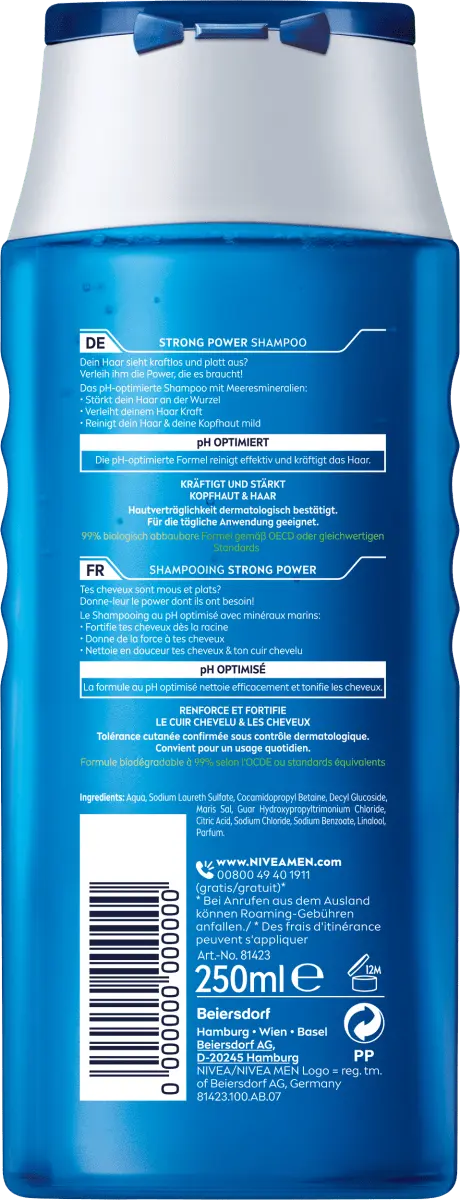 Веганский шампунь NIVEA MEN Strong Power с морскими минералами придает волосам силу и придает слабый вид , плоские волосы. Биоразлагаемая на 99% формула (в соответствии со стандартами ОЭСР или эквивалентными стандартами) с дерматологически подтвержденной совместимостью с кожей и оптимизированным значением pH эффективно очищает и укрепляет кожу головы и волосы. Он также не содержит силиконов и твердых микропластиков, а также водорастворимых, чисто синтетических полимеров (согласно определению ЮНЕП).