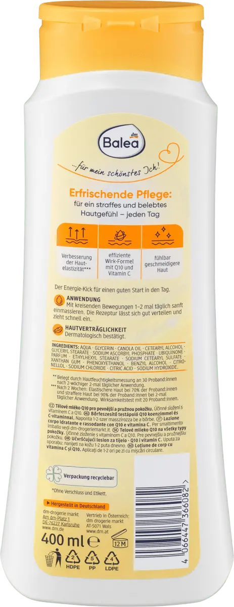 The Balea для укрепления кожи лосьон для тела Q10 — бодрящий увлажняющий крем для освежающего хорошего начала дня. Благодаря ценному витамину С кожа становится заметно более эластичной, а при регулярном использовании она заметно становится более эластичной. Эффективная активная формула делает кожу более упругой, а освежающая, быстро впитывающаяся формула обеспечивает успокаивающее увлажнение в течение 72 часов. Кроме того, вдохновляющий аромат трогает чувства и придает заряд энергии на весь день. Рецепт без микропластика и водорастворимых, чисто синтетических полимеров.