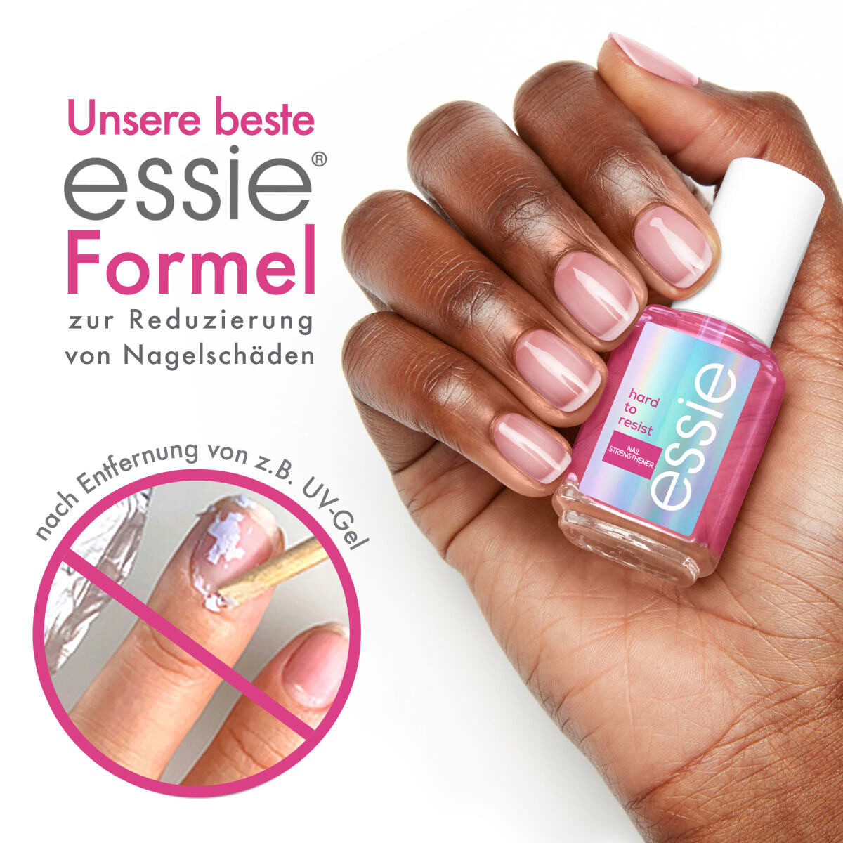 С отвердителем для ногтей трудно сопротивляющимся розовому цвету от essie, ваши ногти станут менее ломкими уже через три дня. Технология бондинга ногтей заметно укрепляет ослабленную и поврежденную поверхность ногтя. Ваши ногти будут защищены от ежедневного износа, поскольку отвердитель для ногтей образует защитную поверхность. Розовый подтон также придает ногтям приятный блеск.