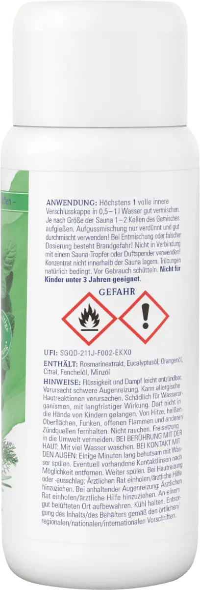 Смешайте максимум 1 полный внутренний колпачок с 0,5–1 л воды. В зависимости от размера сауны налейте 1-2 половника смеси. Используйте инфузионную смесь только в разбавленном и хорошо перемешанном виде! При расслоении или неправильной дозировке существует опасность возгорания! Не используйте вместе с капельницей для сауны или дозатором ароматизаторов! Не храните концентрат внутри сауны. Мутность, конечно, по определенным причинам. Перед использованием встряхните. Не подходит для детей младше 3 лет.