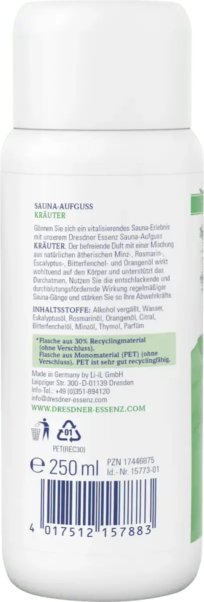 Побалуйте себя восстанавливающим отдыхом в сауне Dresdner Essenz. настой трав. Освобождающий аромат со смесью натуральных эфирных масел мяты, розмарина, эвкалипта, горького фенхеля и апельсина благотворно влияет на организм и поддерживает дыхание. Используйте детоксикационное и стимулирующее кровообращение действие регулярных сеансов сауны и укрепите свой иммунитет.