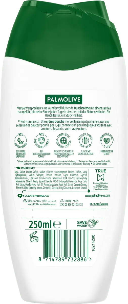 Аква, лаурет натрия Сульфат, хлорид натрия, кокамидопропилбетаин, отдушка, лаурилгидроксисултаин, салицилат натрия, бензоат натрия, дистеарат гликоля, глицерин, поликватерниум-7, лимонная кислота, коко-глюкозид, тетранатрий ЭДТА, пентаэритритилтетрастеарат ПЭГ-150, глицерилолеат, глицерилстеарат, PPG-2 Гидроксиэтилкокамид, экстракт плодов фикуса карика, фруктовое масло Olea Europaea, экстракт плодов Prunus Amygdalus Dulcis, масло цветов Cananga Odorata, альфа-изометилионон, цитронеллол, гераниол, гексил циннамал, лимонен, линалоол.