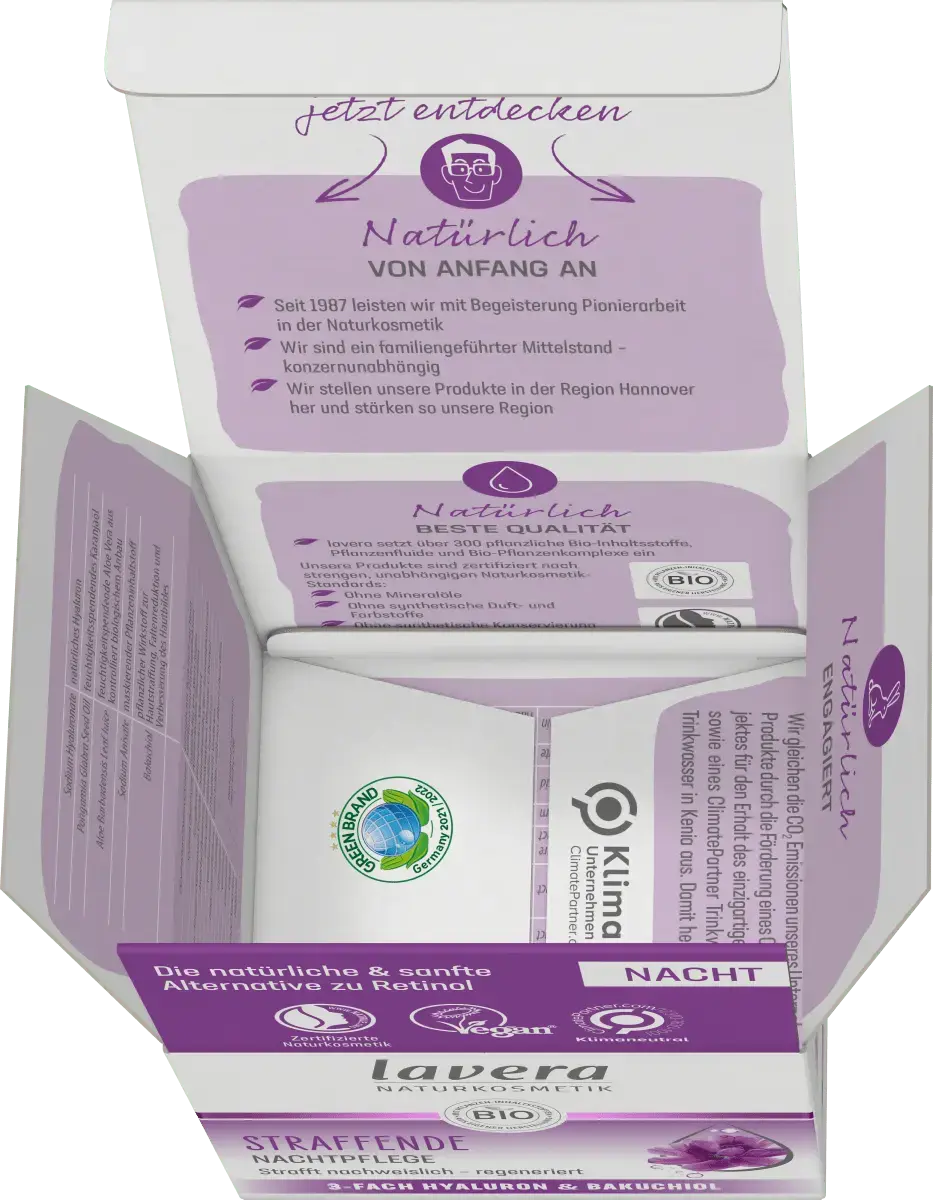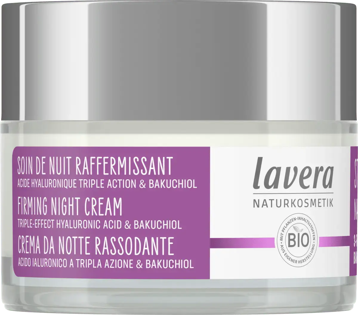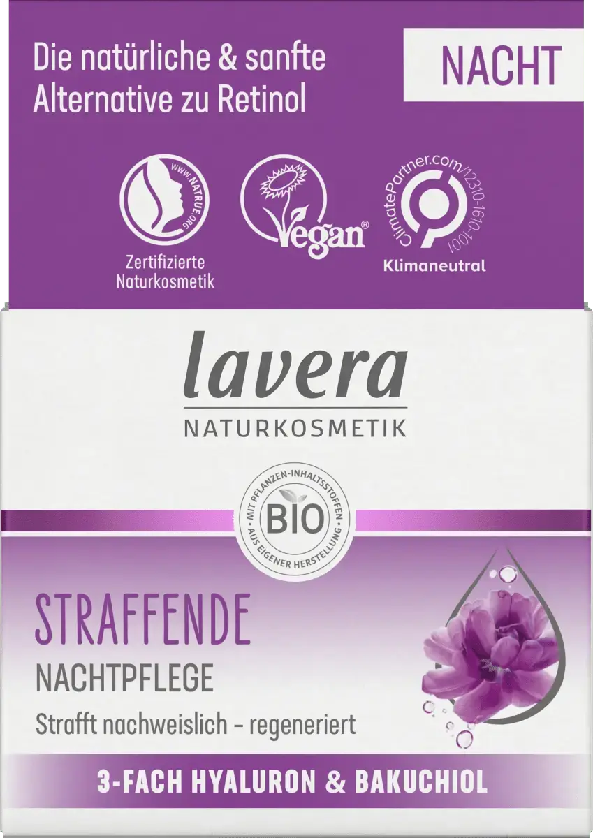 Укрепляющий ночной уход от Lavera с тройной гиалуроновой кислотой и мощным активным ингредиентом Бакучиол. естественное воздействие на процесс старения кожи. Доказано, что высокоэффективная и хорошо переносимая формула стимулирует собственную коллагеновую систему кожи и уменьшает морщины. Почувствуйте, как богатая текстура окутывает вашу кожу, интенсивно питает ее и поддерживает регенерацию ночью, чтобы утром кожа стала более упругой и свежей. Гиалуроновая кислота — настоящее чудо увлажнения, поскольку она увеличивает содержание влаги в коже и тем самым эффективно уменьшает морщины. С другой стороны, бакучиол, который он содержит, является мягкой и естественной альтернативой ретинолу. Мощный активный ингредиент, полученный из индийского растения Бабчи, поддерживает развитие коллагеновой системы кожи. Совместимость также подтверждена дерматологически.