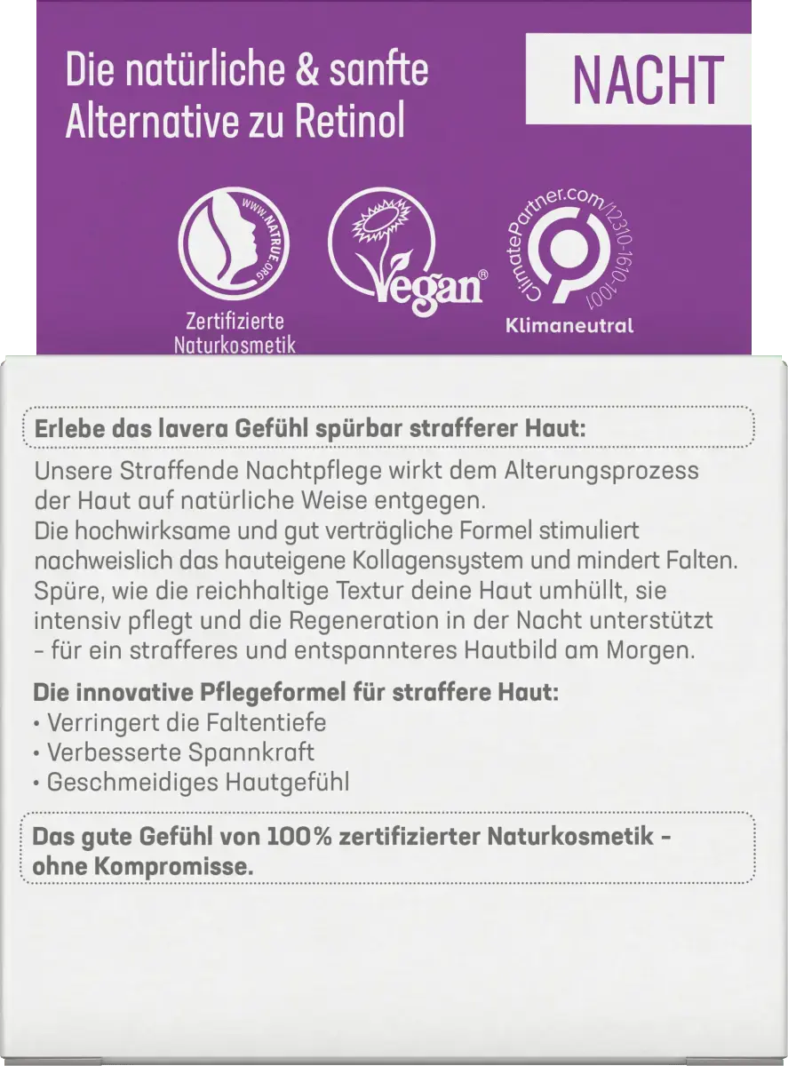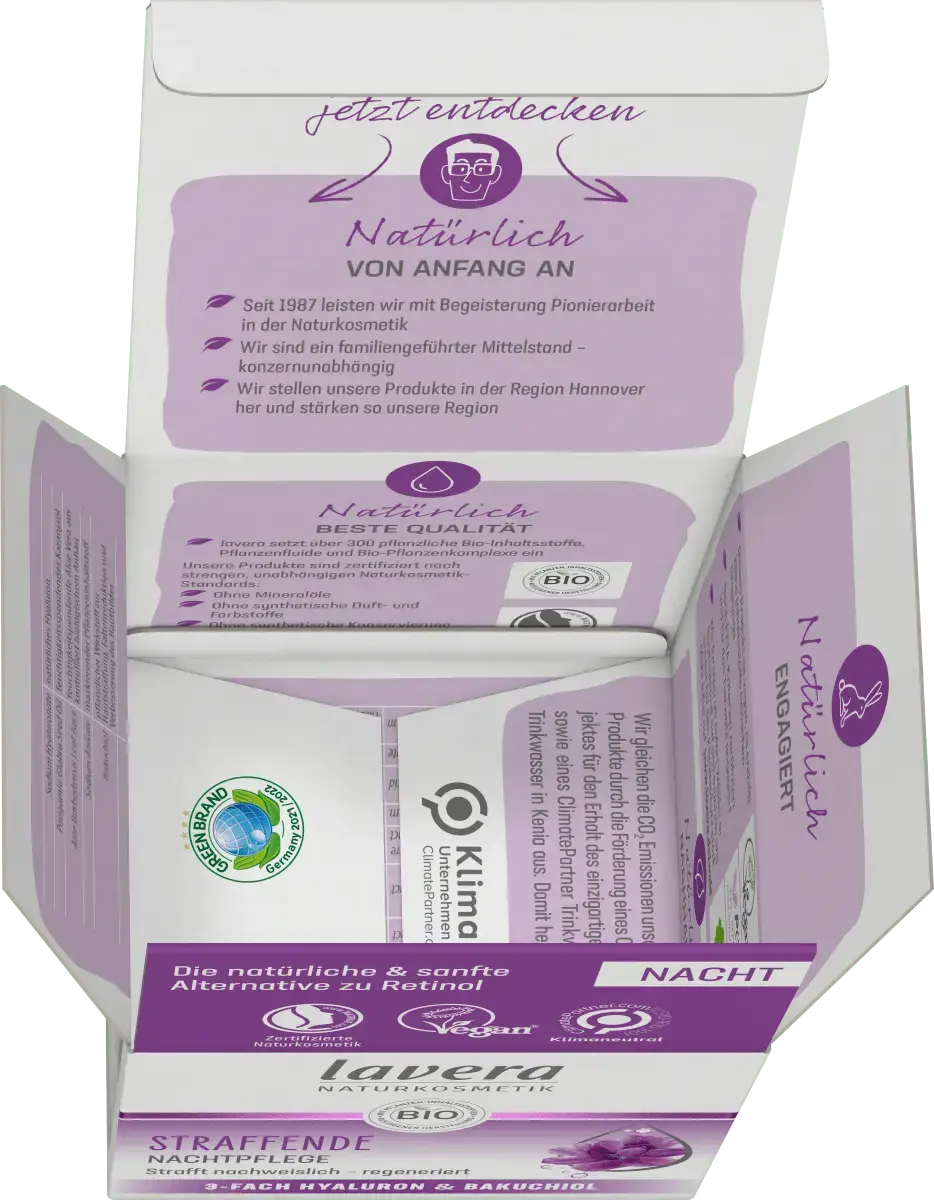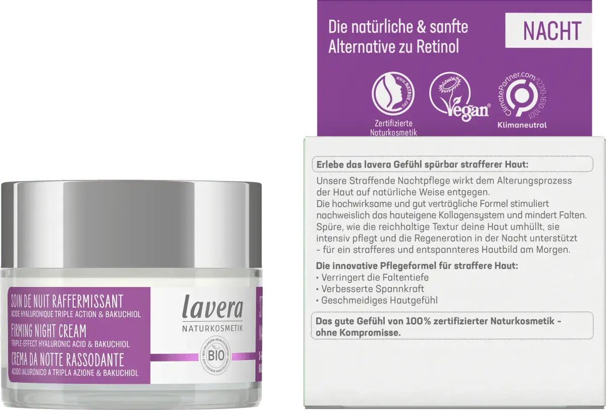 Укрепляющий ночной уход от Lavera с тройной гиалуроновой кислотой и мощным активным ингредиентом Бакучиол. естественное воздействие на процесс старения кожи. Доказано, что высокоэффективная и хорошо переносимая формула стимулирует собственную коллагеновую систему кожи и уменьшает морщины. Почувствуйте, как богатая текстура окутывает вашу кожу, интенсивно питает ее и поддерживает регенерацию ночью, чтобы утром кожа стала более упругой и свежей. Гиалуроновая кислота — настоящее чудо увлажнения, поскольку она увеличивает содержание влаги в коже и тем самым эффективно уменьшает морщины. С другой стороны, бакучиол, который он содержит, является мягкой и естественной альтернативой ретинолу. Мощный активный ингредиент, полученный из индийского растения Бабчи, поддерживает развитие коллагеновой системы кожи. Совместимость также подтверждена дерматологически.