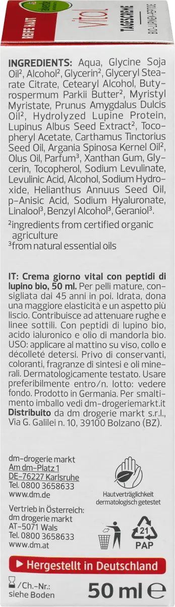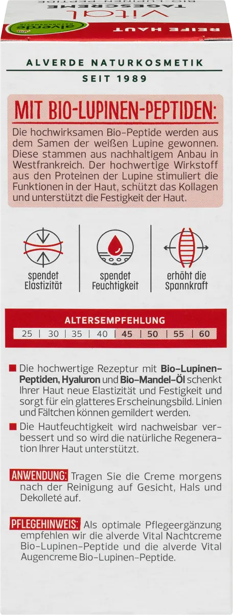 Жизненный ночной крем от Alverde NATURKOSMETIK содержит высокоэффективные органические пептиды, полученные из семян люпина белого. Они происходят из устойчивого выращивания на западе Франции. Высококачественный активный ингредиент белков люпина стимулирует функции кожи, защищает коллаген и поддерживает упругость кожи. Рецепт без микропластика и водорастворимых, чисто синтетических полимеров.