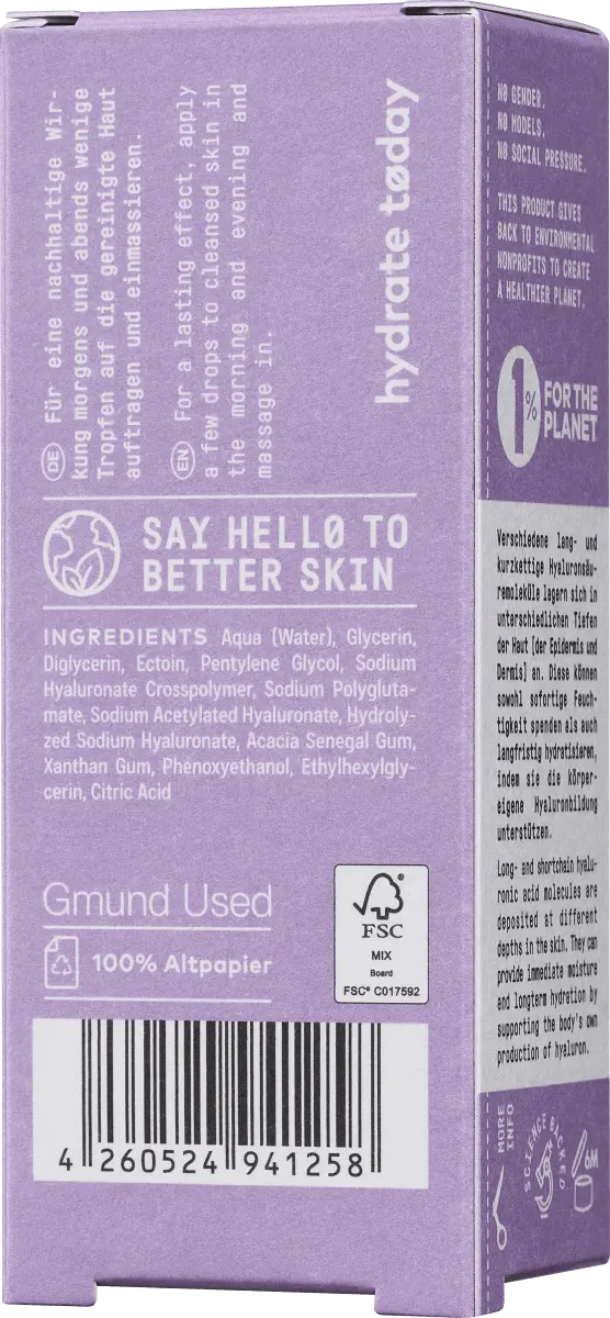 Nø гидрат сегодня HyaluronSerum от Nø Cosmetics – это сыворотка, обеспечивающая интенсивное увлажнение кожи. Инновационный гиалуроновый комплекс 4D поддерживает как немедленное увлажнение, так и долгосрочное увлажнение, способствуя образованию собственной гиалуроновой кислоты в организме. Также сыворотка содержит эктоин, который укрепляет кожу и предотвращает потерю влаги. Формула чистой красоты без отдушек обеспечивает всесторонний уход за кожей в пространстве и во времени.
