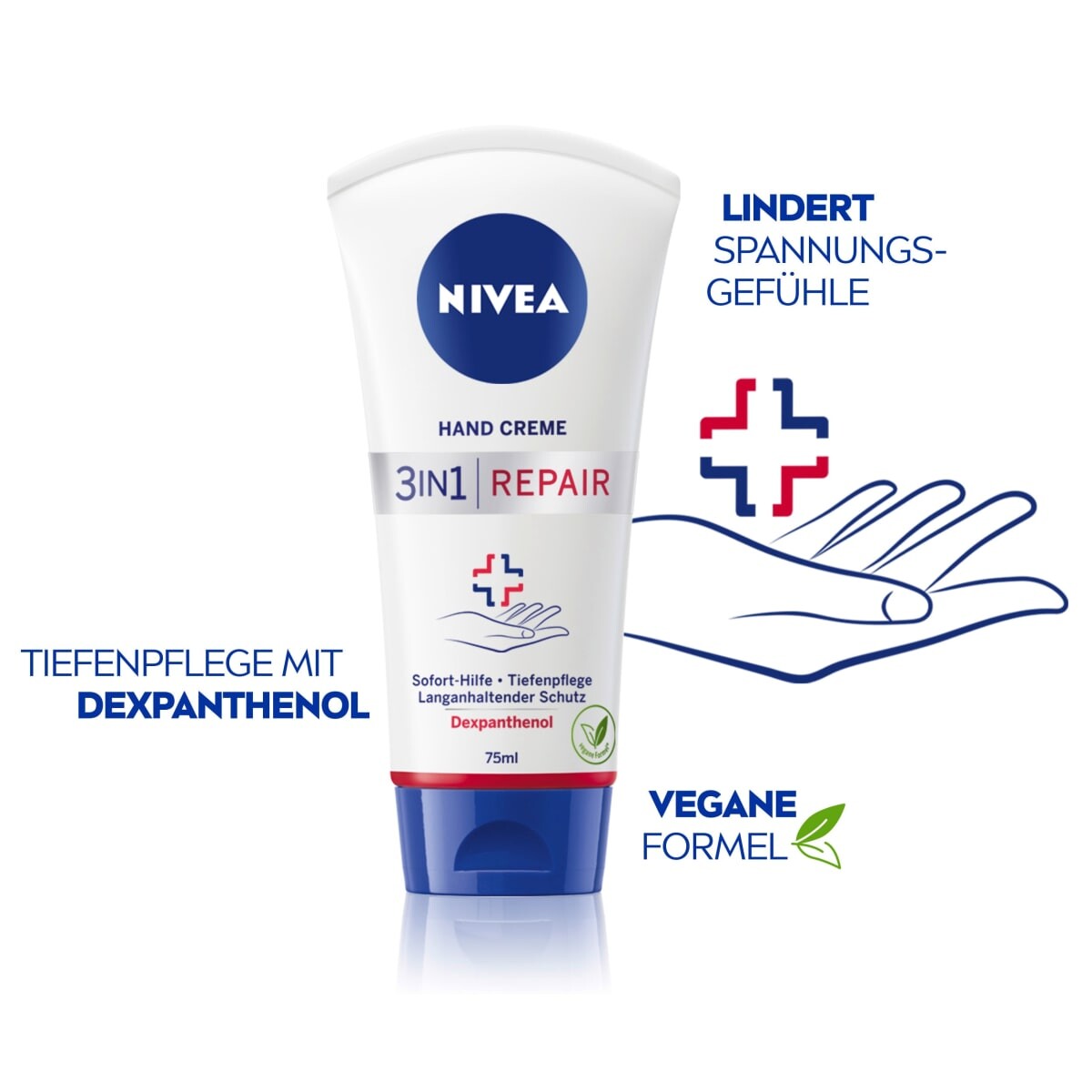 Хотите крем для рук, который мгновенно успокаивает сухую кожу , потрескавшиеся руки , защищает и обеспечивает длительный уход? Тогда крем для рук NIVEA 3в1 Ремонт именно то, что вам нужно: формула с декспантенолом мгновенно снимает ощущение напряжения в особо сухих руках и защищает ваши руки в течение 24 часов.